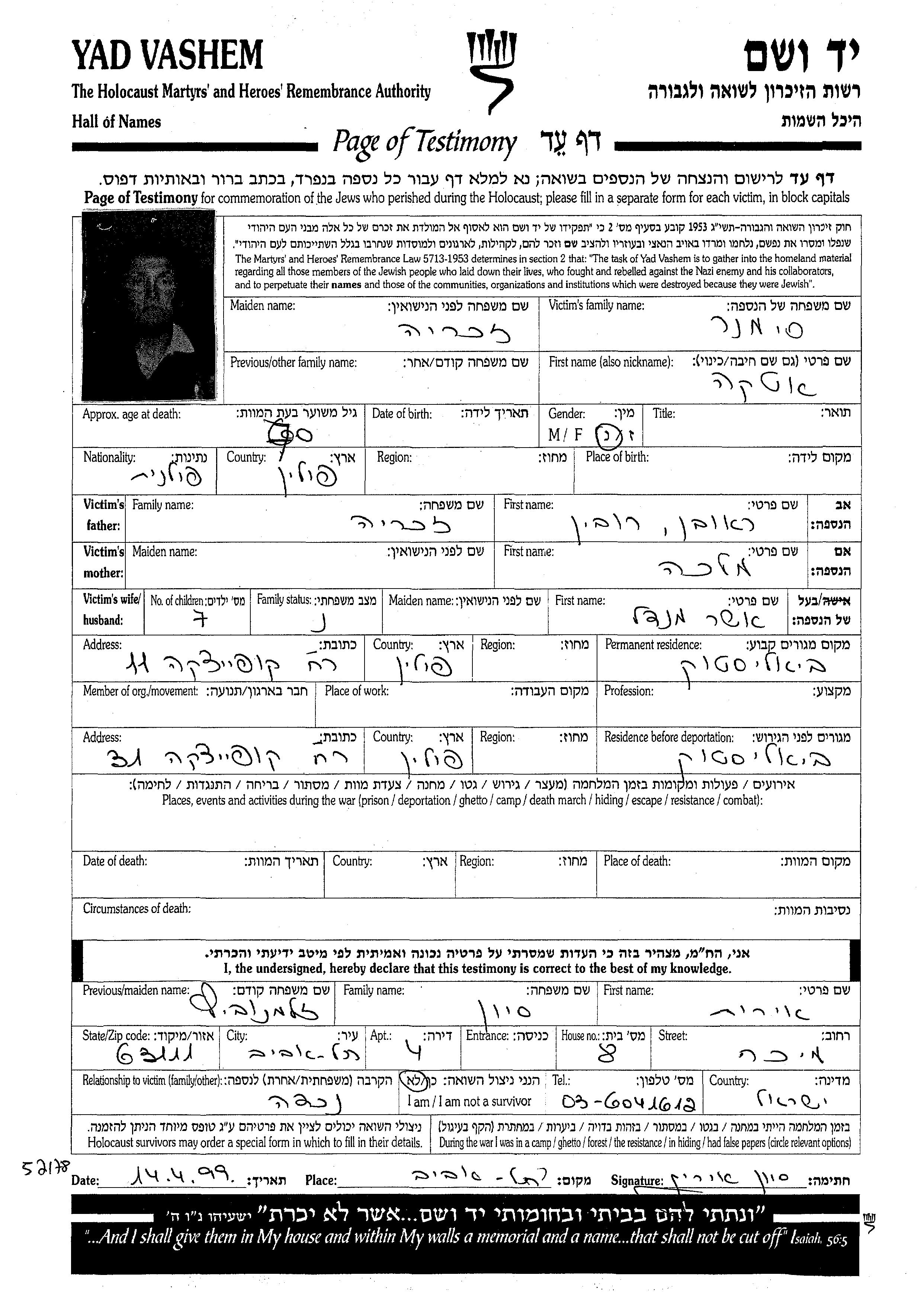 Yad Vashem - Pages of Testimony Names Memorial Collection