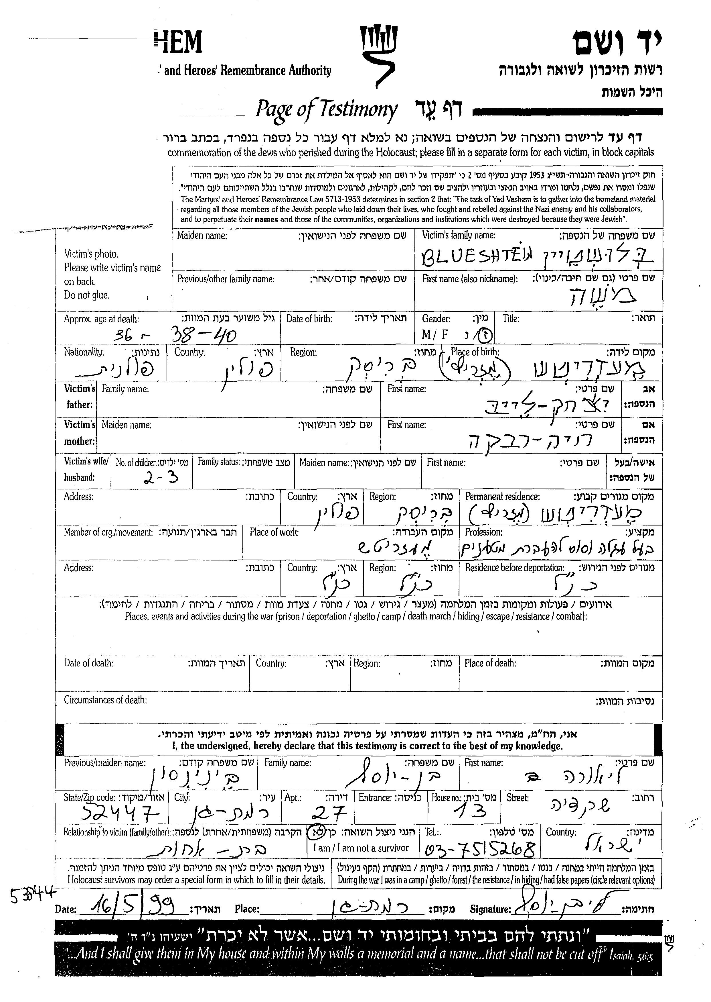 Blueshtein Moshe Mezerits, Pologne Feuille de témoignage