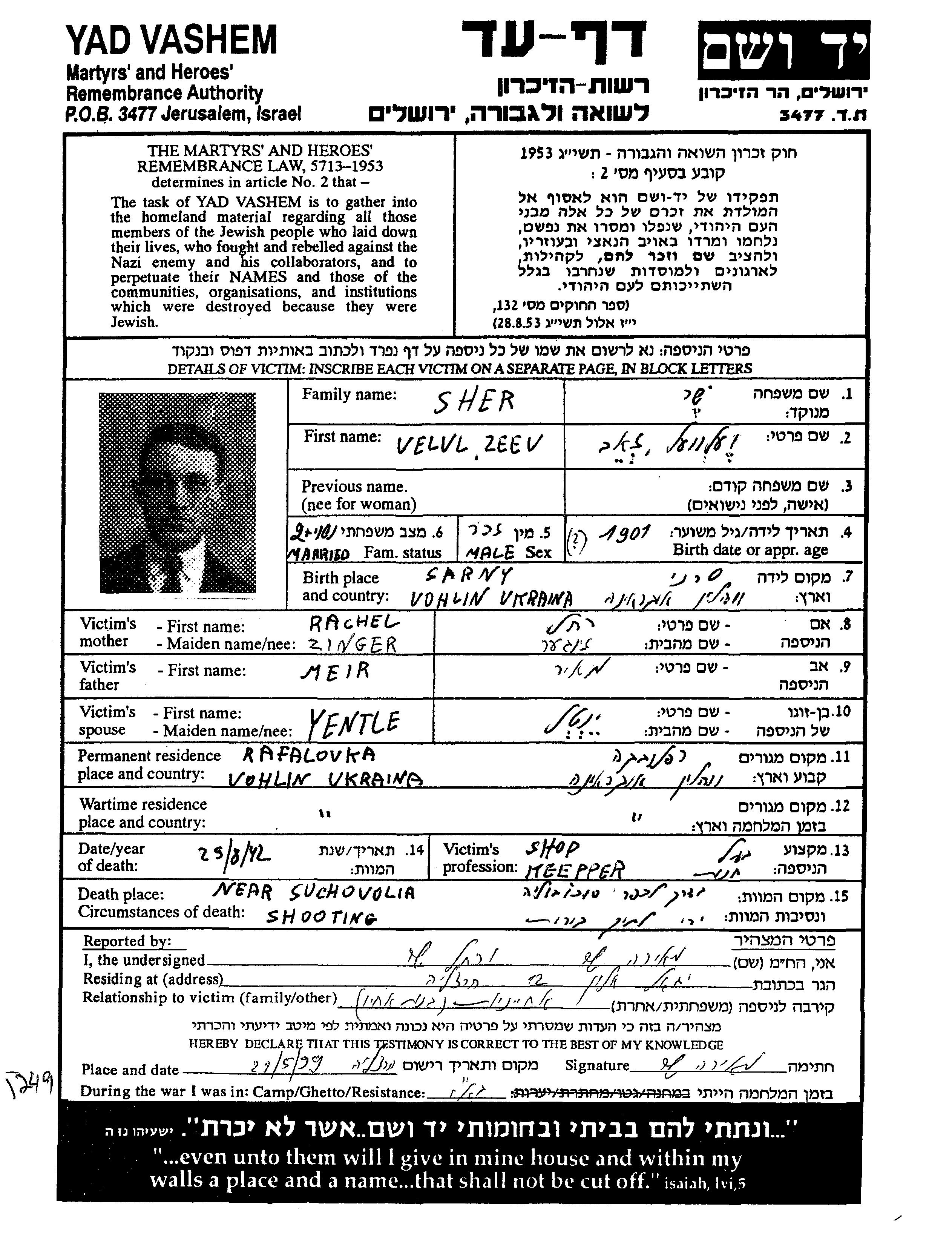 Sher | Velvl Zeev | 1901 | Rafalovka, Pologne | Feuille de témoignage |