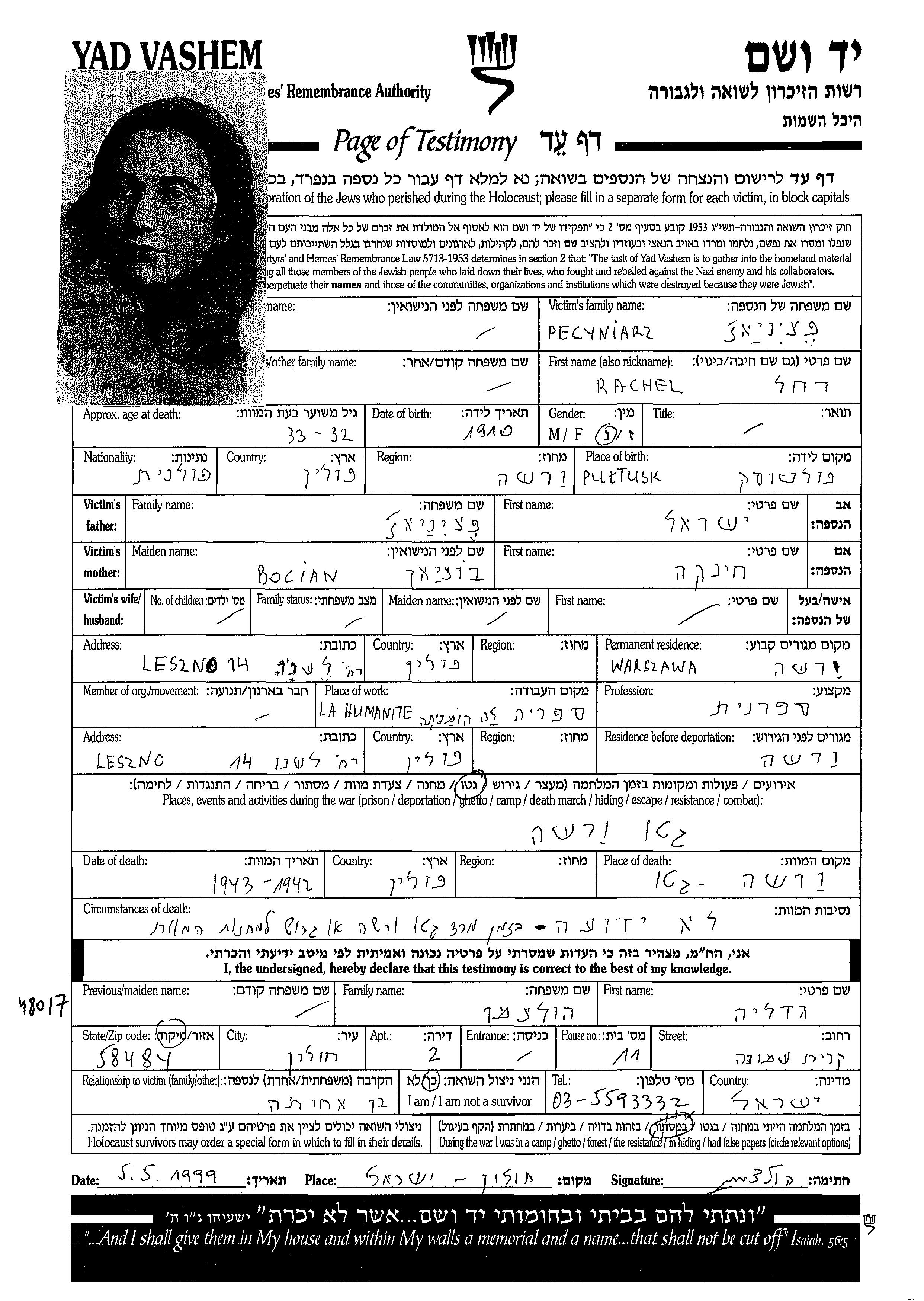 Yad Vashem - Pages of Testimony Names Memorial Collection