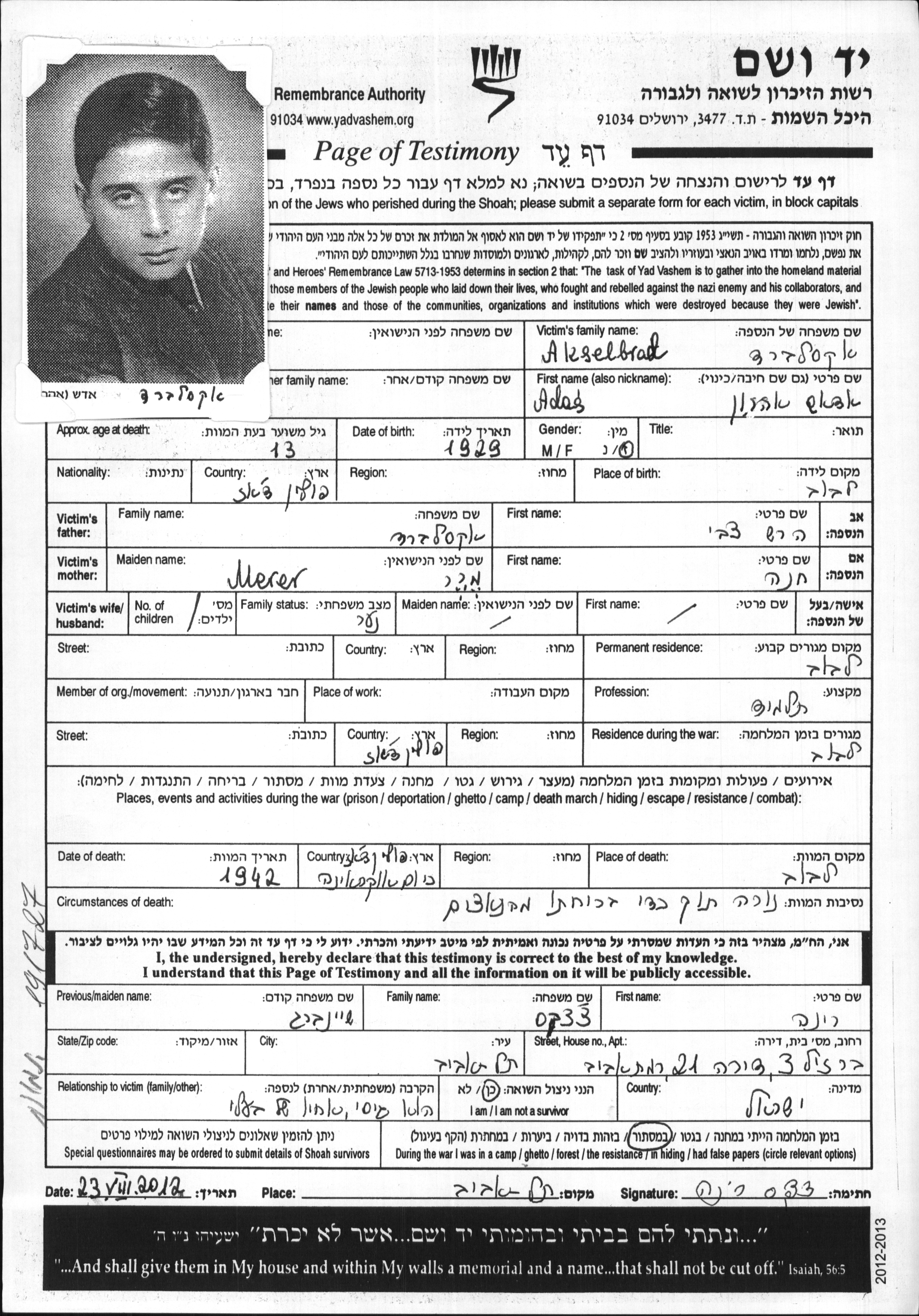 Akselbrad Adas Aharon 1929 Lwow, Pologne Feuille de témoignage