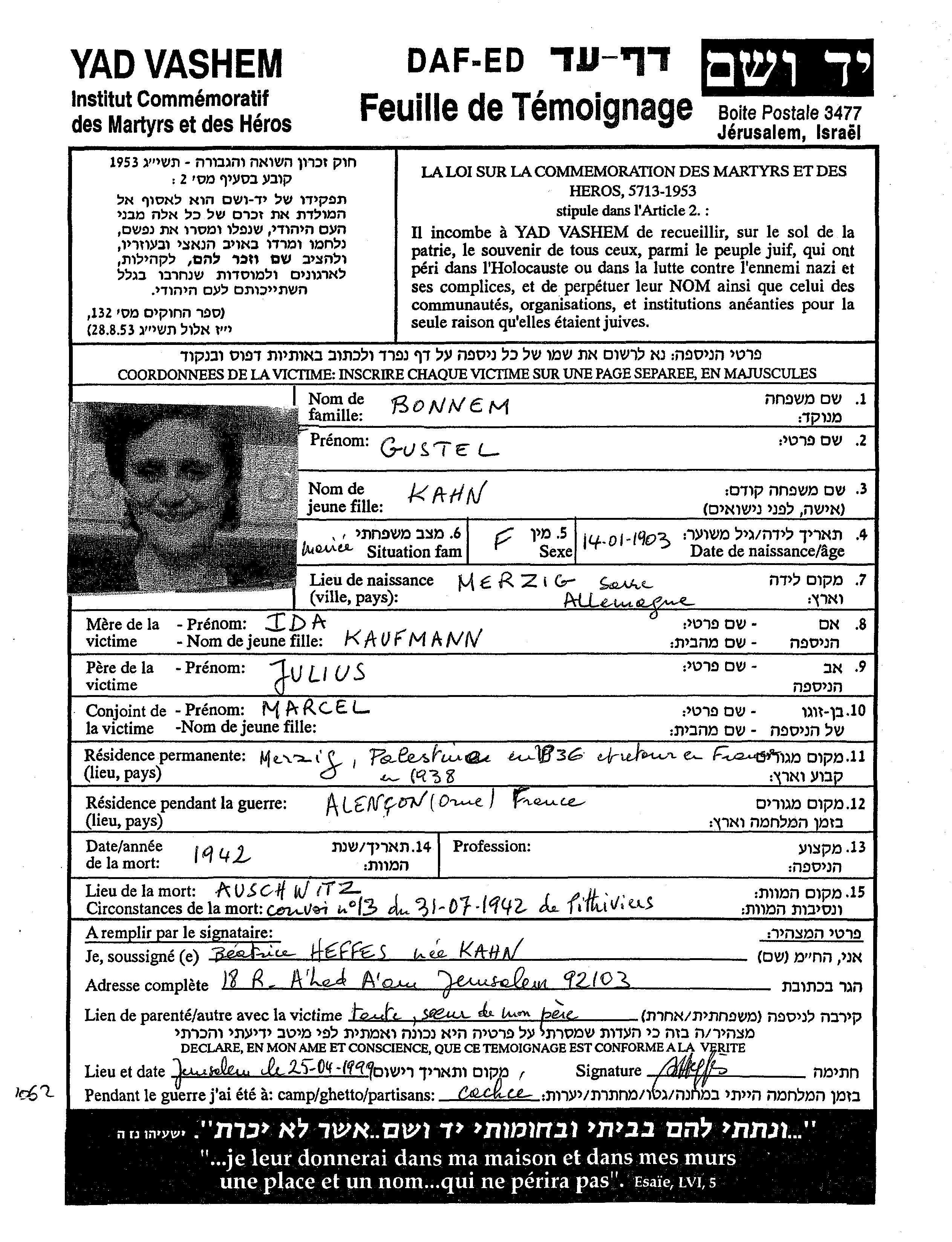 Gustel Bonnem née Kahn est née à Merzig, Allemagne en 1903. Avant la seconde guerre mondiale elle vivait à France.