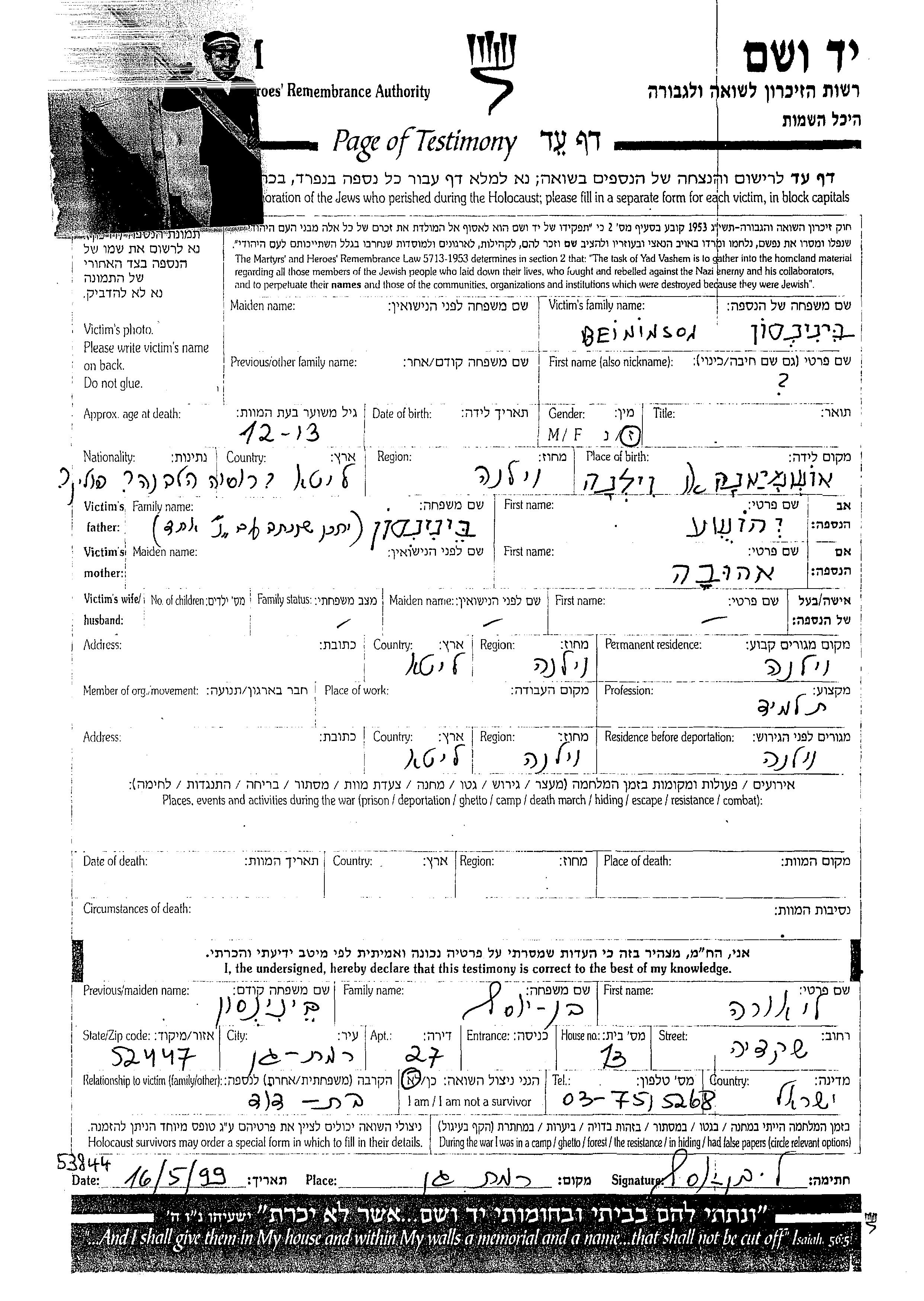 Yad Vashem - Pages of Testimony Names Memorial Collection