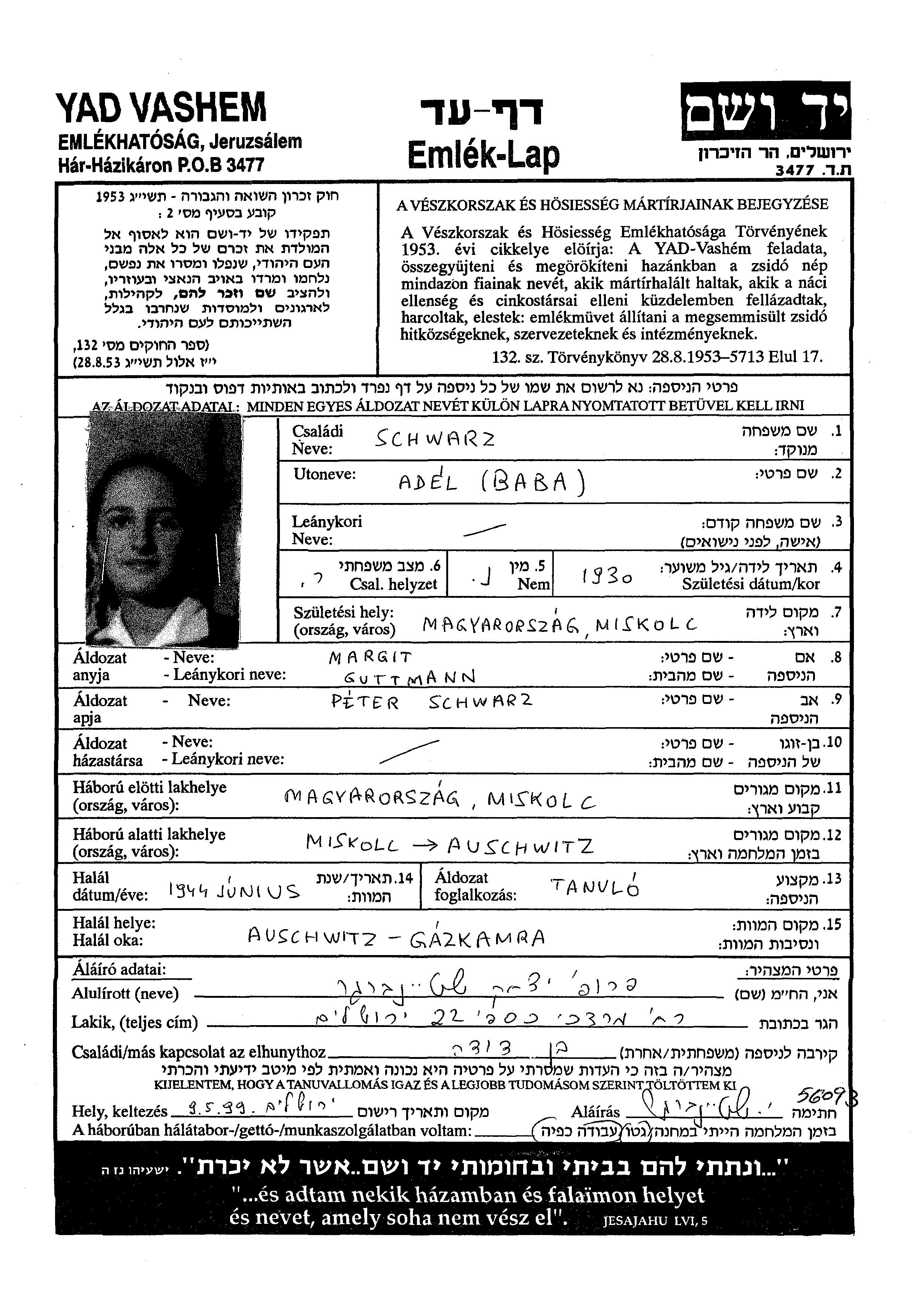 Adel Baba Schwarz est née à Miskolc, Hongrie en 1930. Elle était Élève. Avant la seconde guerre mondiale elle vivait à Miskolc, Hongrie.