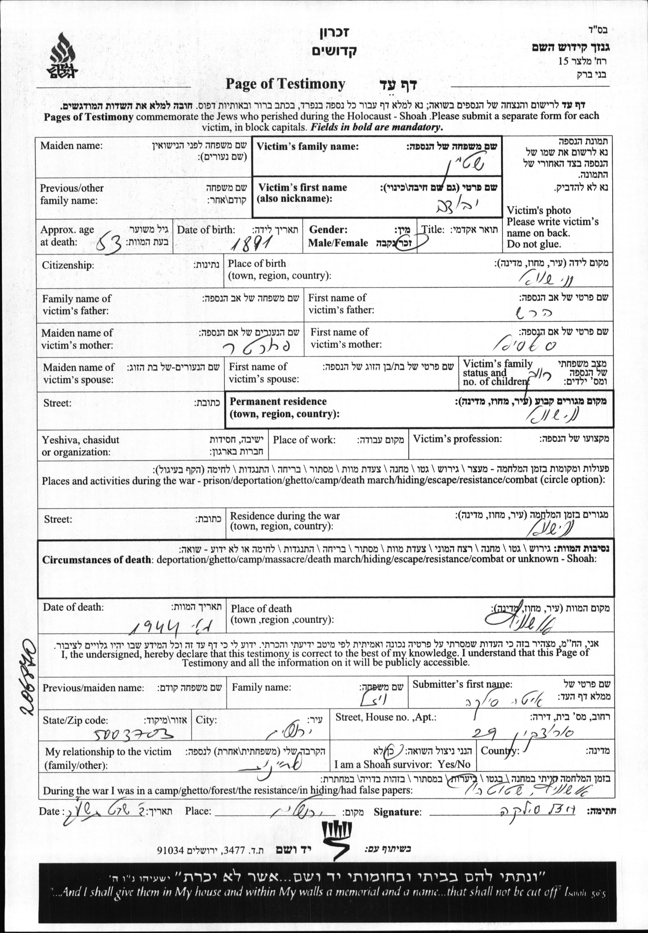 Yad Vashem - Pages of Testimony Names Memorial Collection
