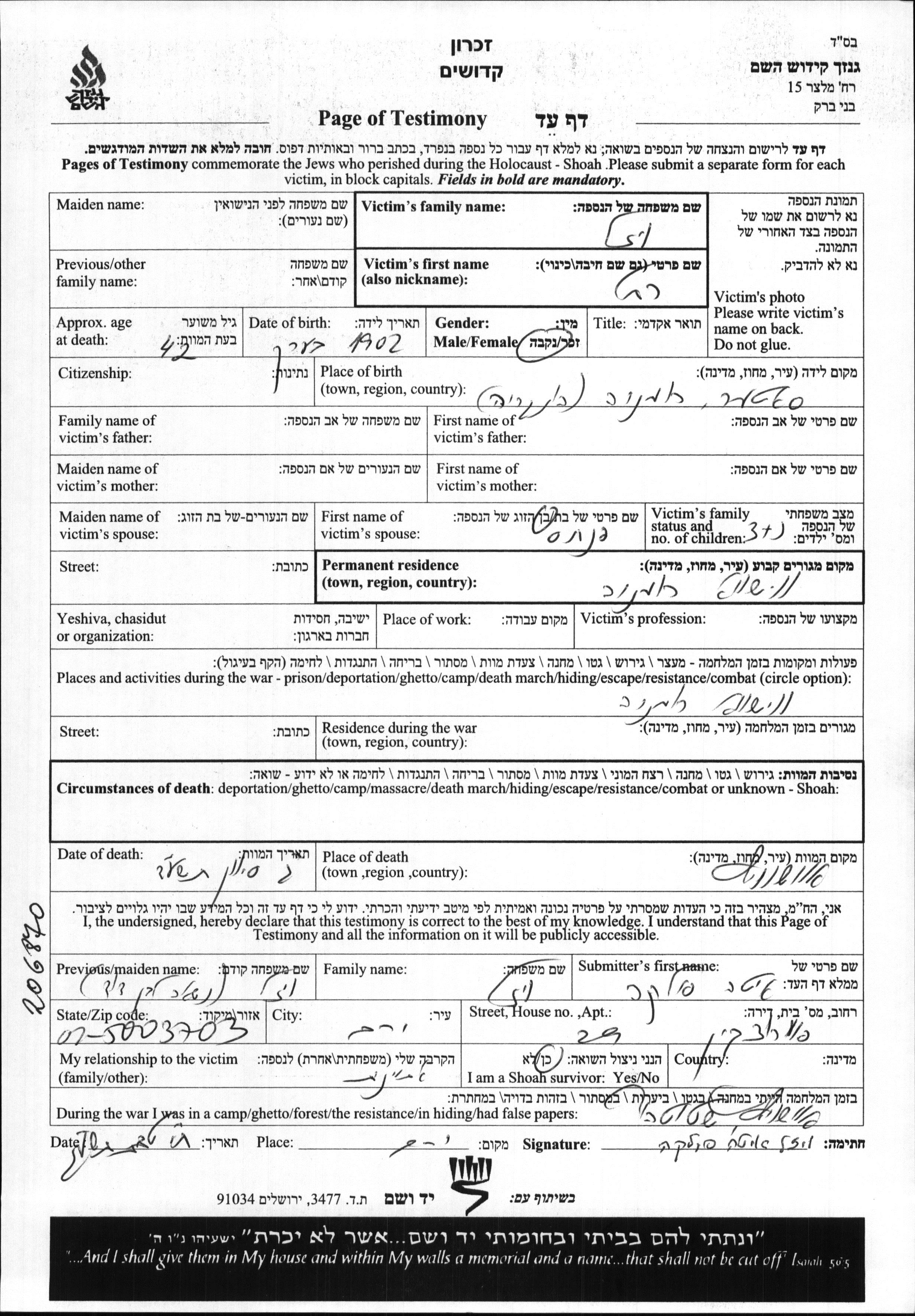 Yad Vashem - Pages of Testimony Names Memorial Collection