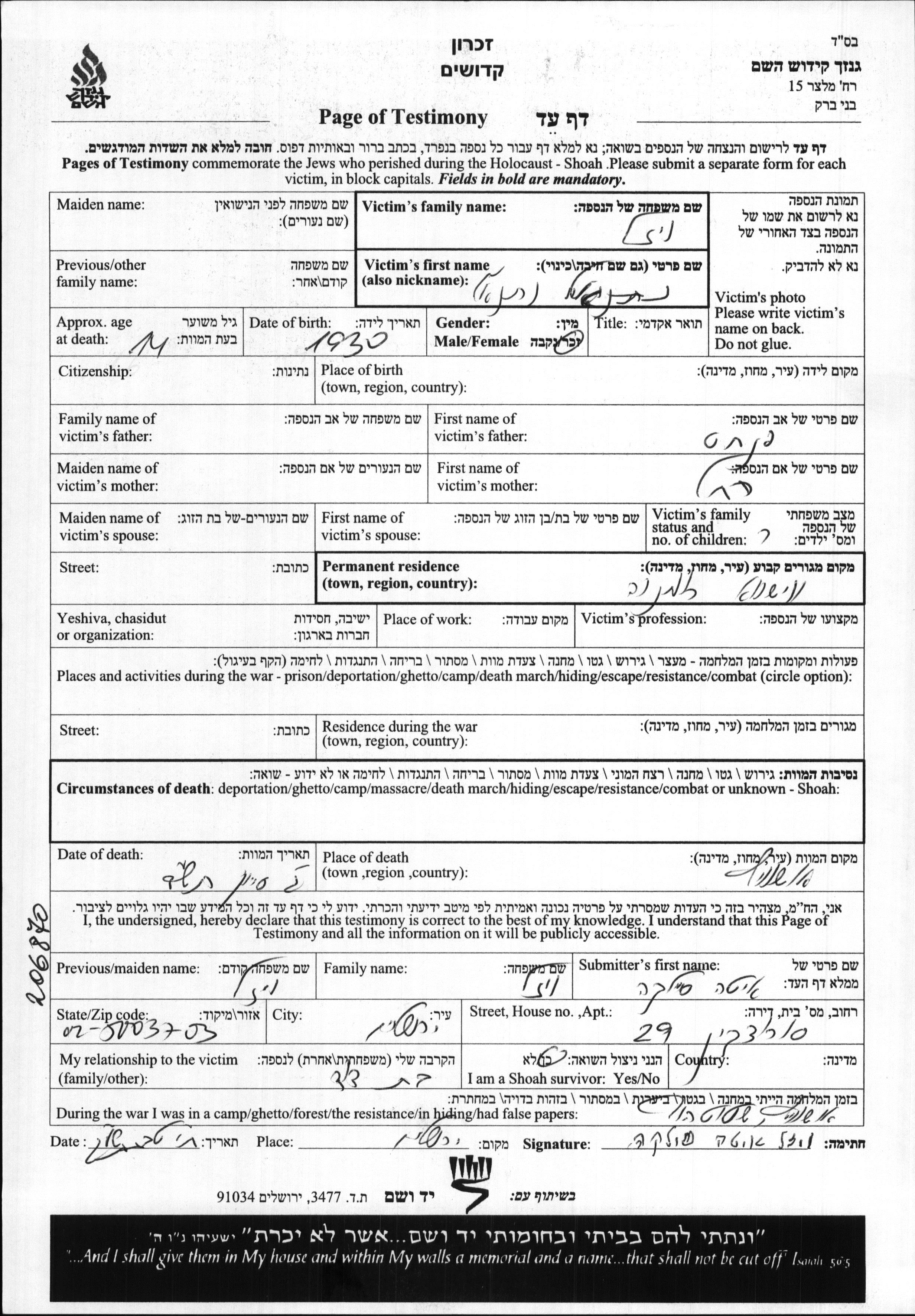 Neizl | Natanel | 1930 | Viseu, Roumanie | Feuille de témoignage |