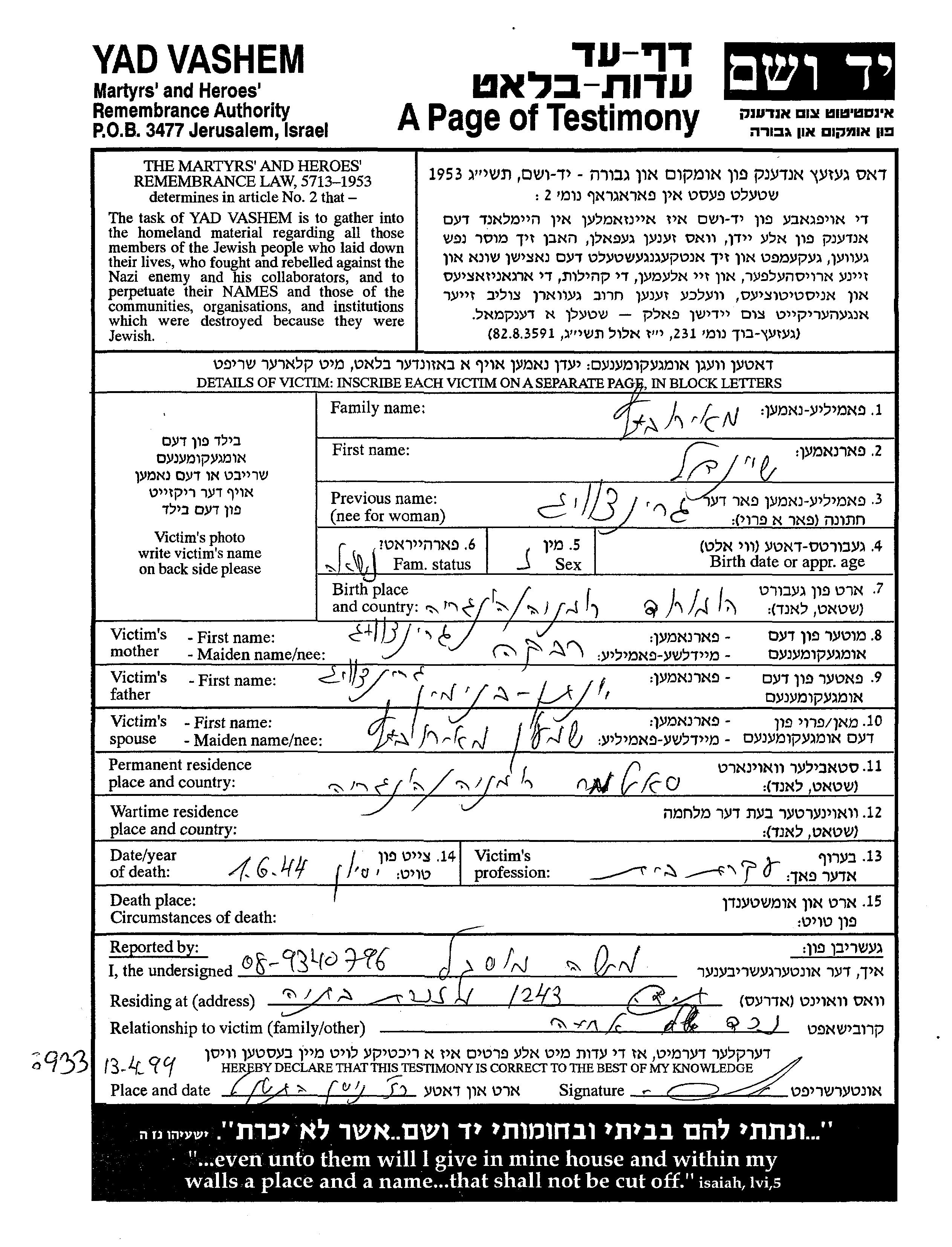 Yad Vashem - Pages of Testimony Names Memorial Collection