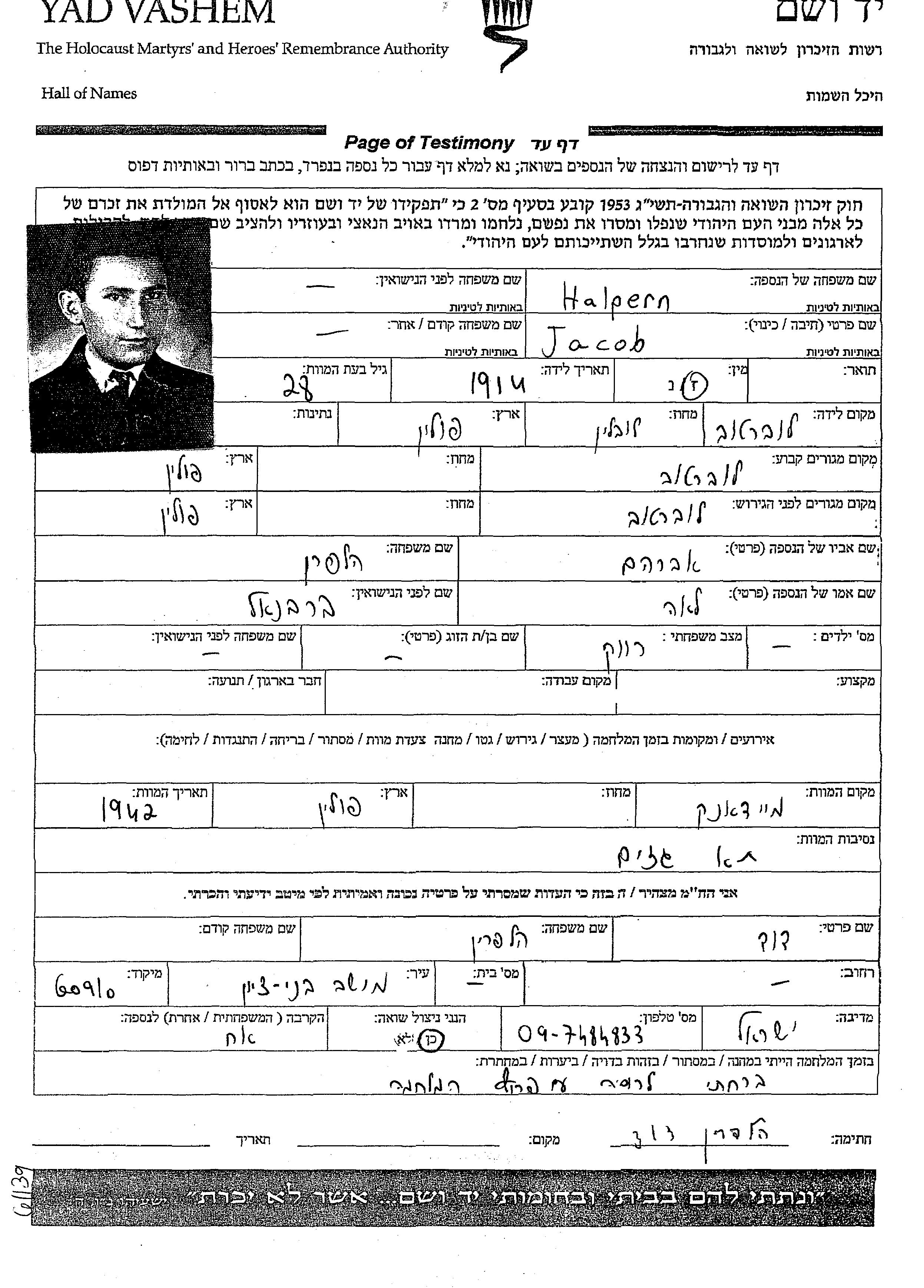 Halpern Jacob 1914 Lubartow, Pologne Feuille de témoignage