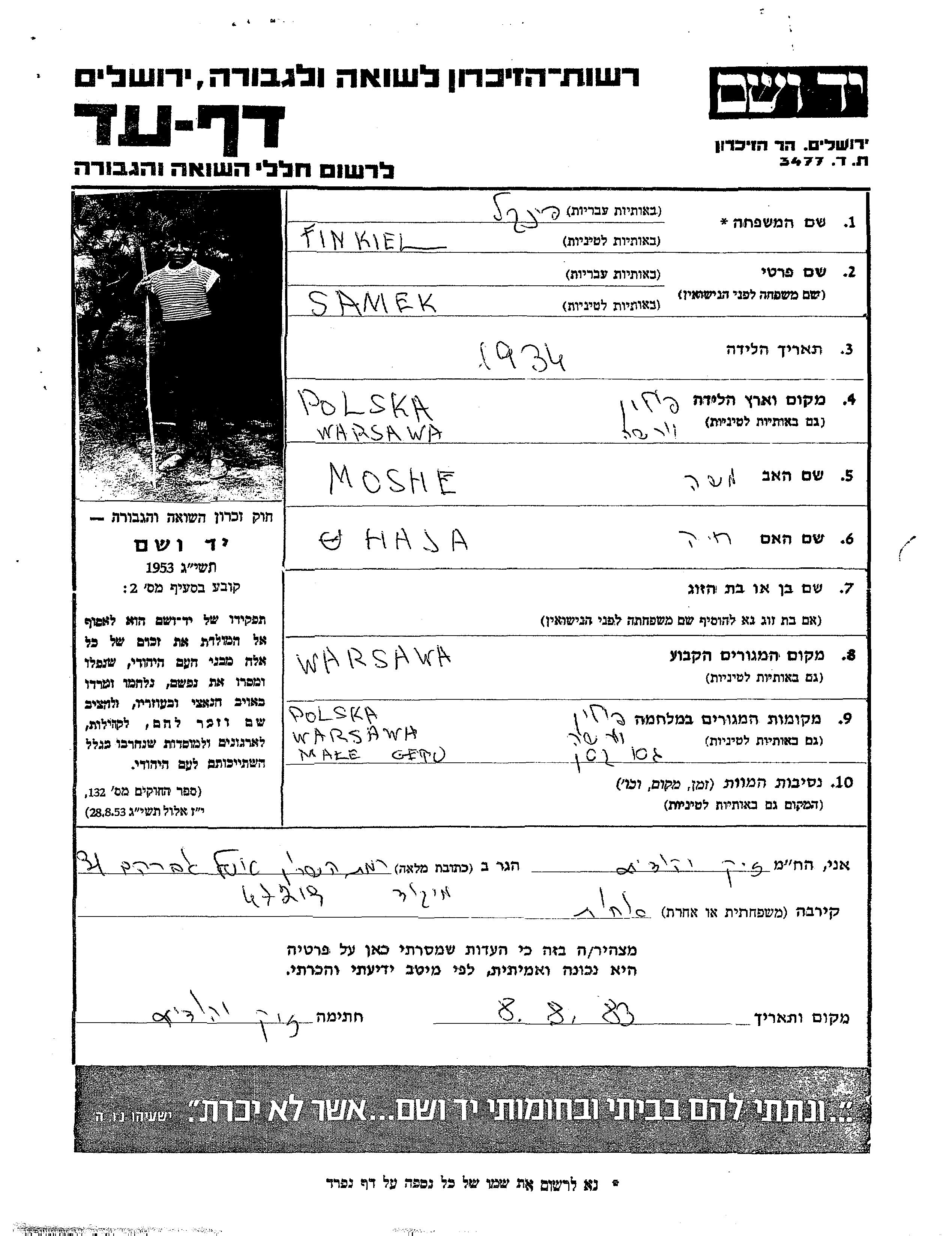 Finkiel | Shmuel | 1934 | Warsaw, Pologne | Feuille de témoignage |