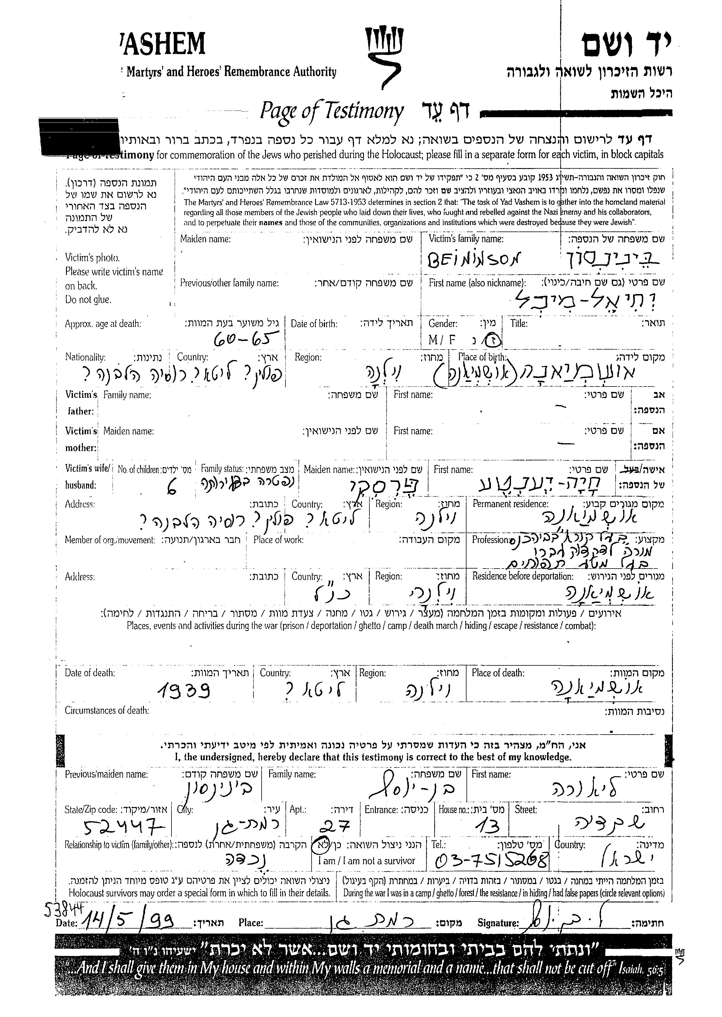 Yad Vashem - Pages of Testimony Names Memorial Collection