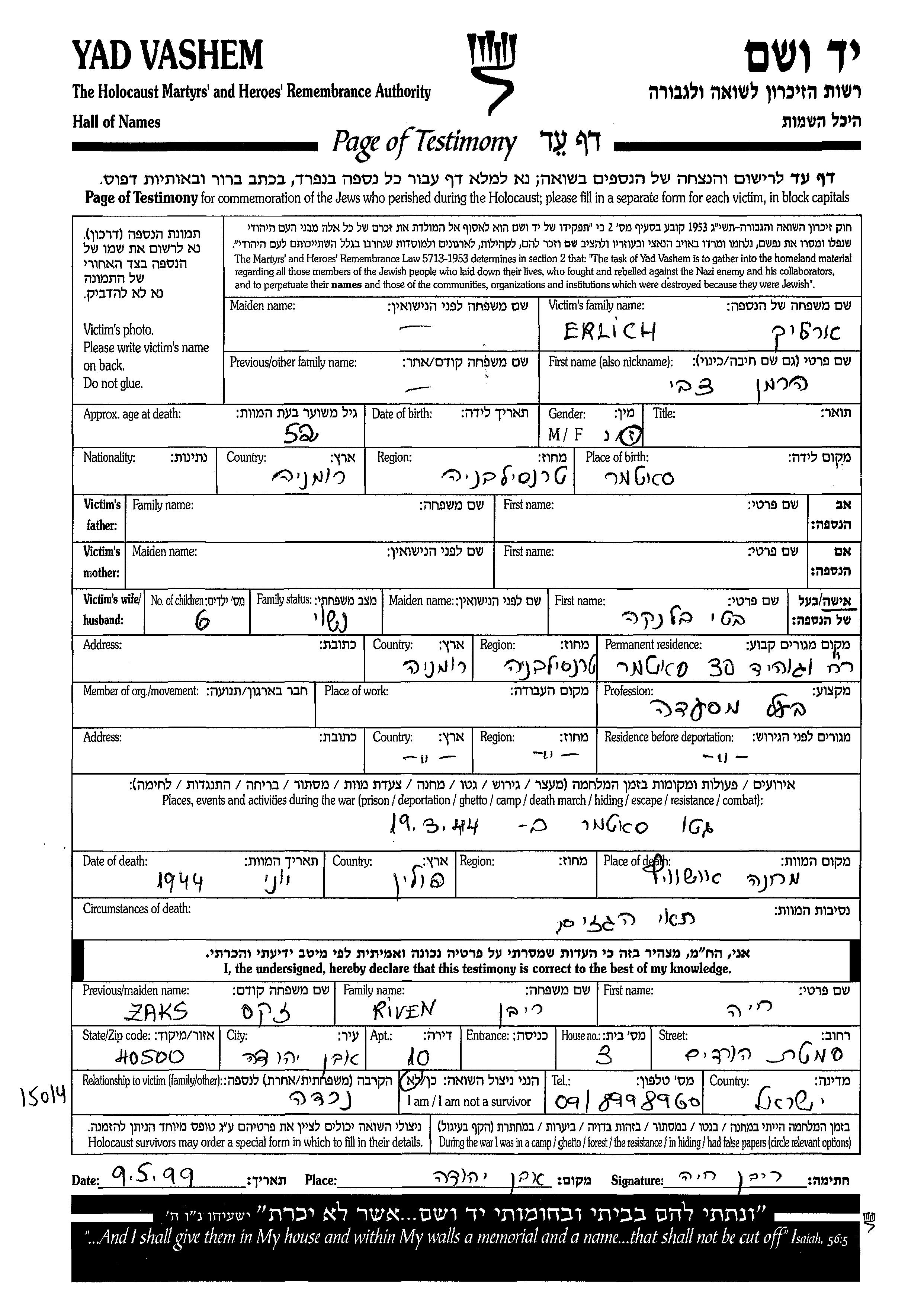 Herman Tzvi Erlich est né à Satu Mare, Roumanie. Il était Restaurateur. Avant la seconde guerre mondiale il vivait à Satu Mare, Roumanie.