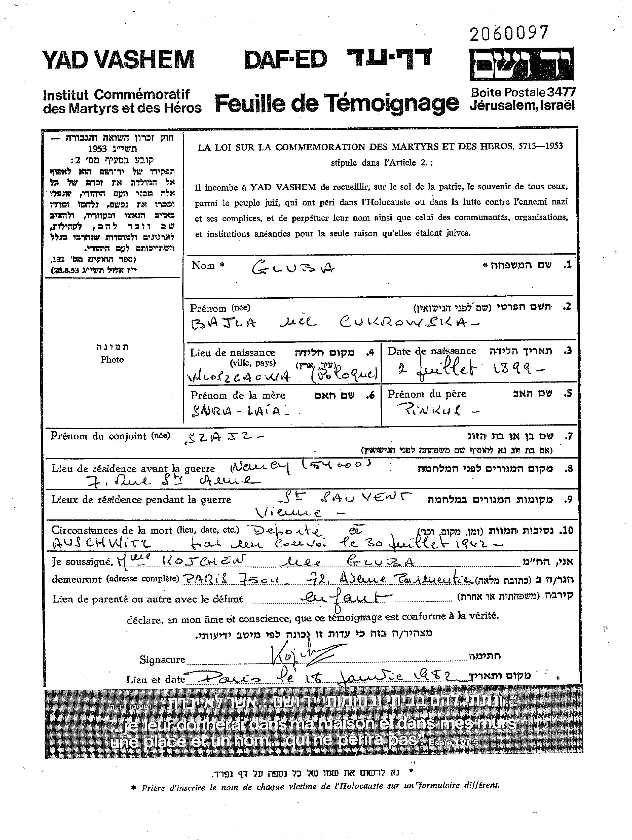Bajla Gluba née Cukrowski est née à Wloszczowa, Pologne en 1899, fille de Pinkhas et de Sura Laia. Elle était Mariée à Szaja. Avant la seconde guerre mondiale elle vivait à Nancy, France. Pendant la guerre, elle était à Wien, Autriche.
