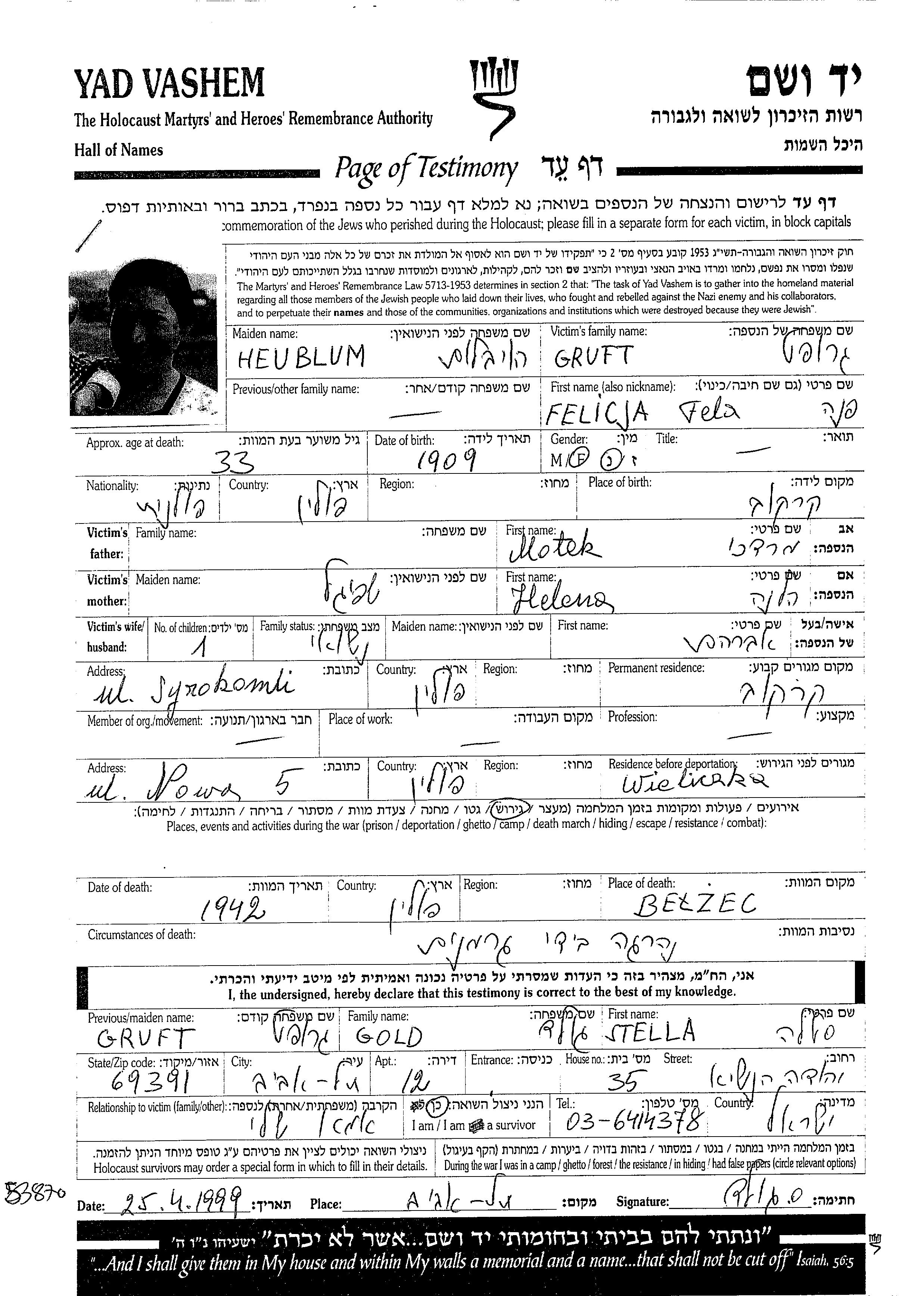 Yad Vashem - Pages of Testimony Names Memorial Collection