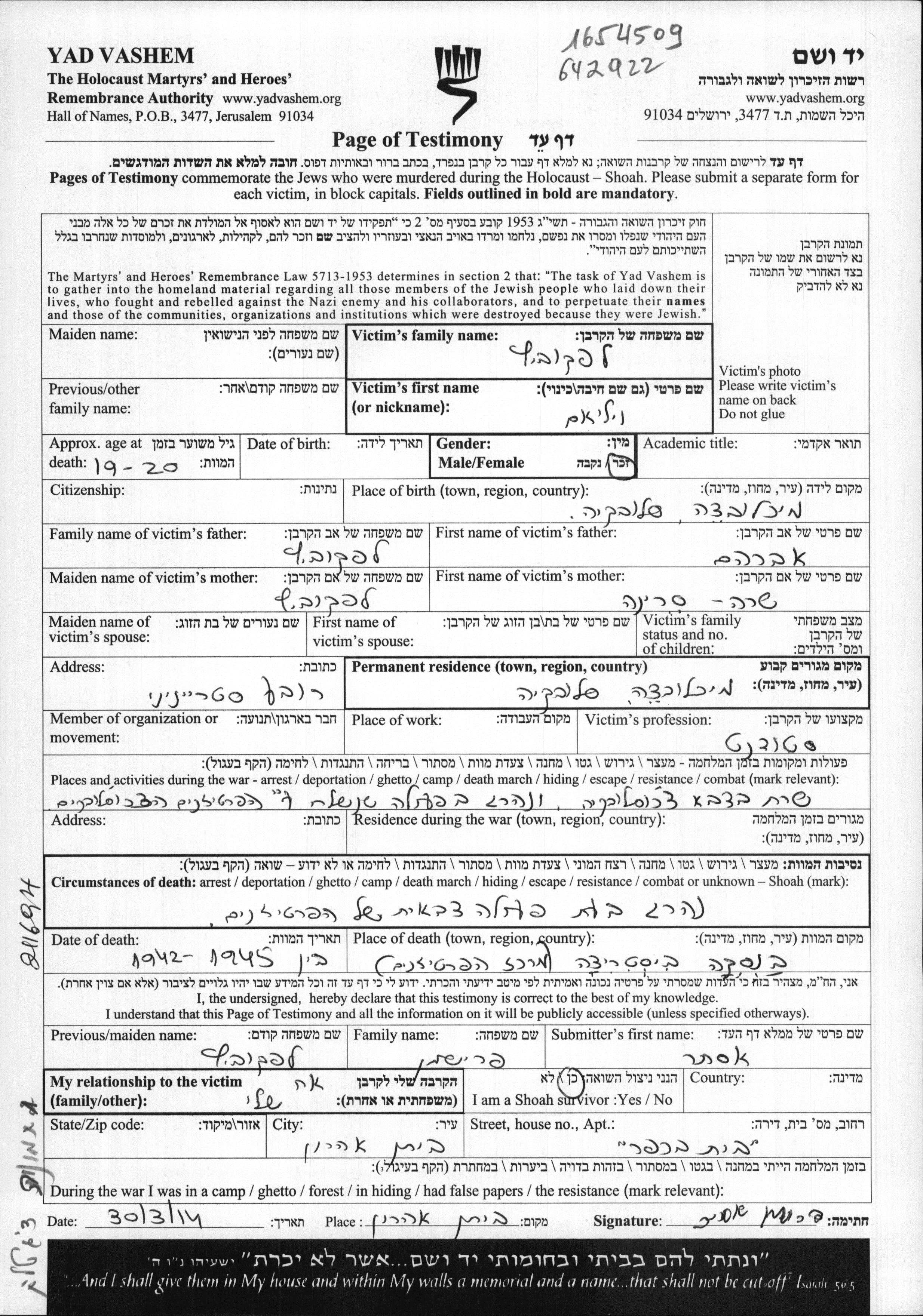 Yad Vashem - Pages of Testimony Names Memorial Collection