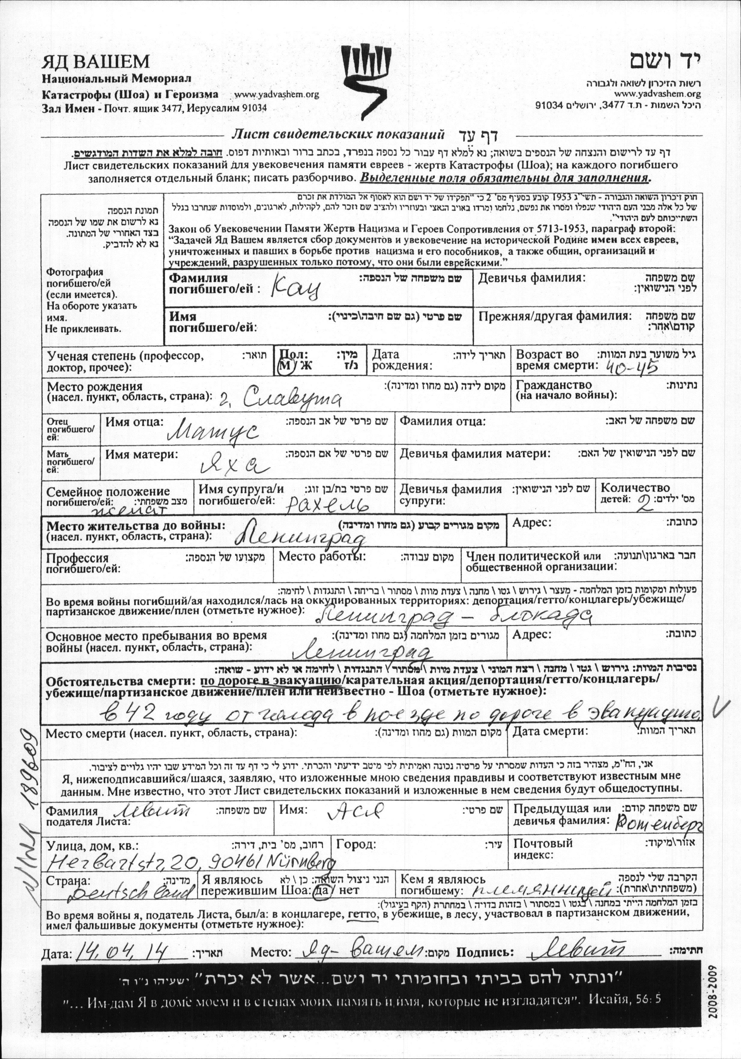 Katz | prénom inconnu | Leningrad, Russie (URSS) | Feuille de témoignage | |