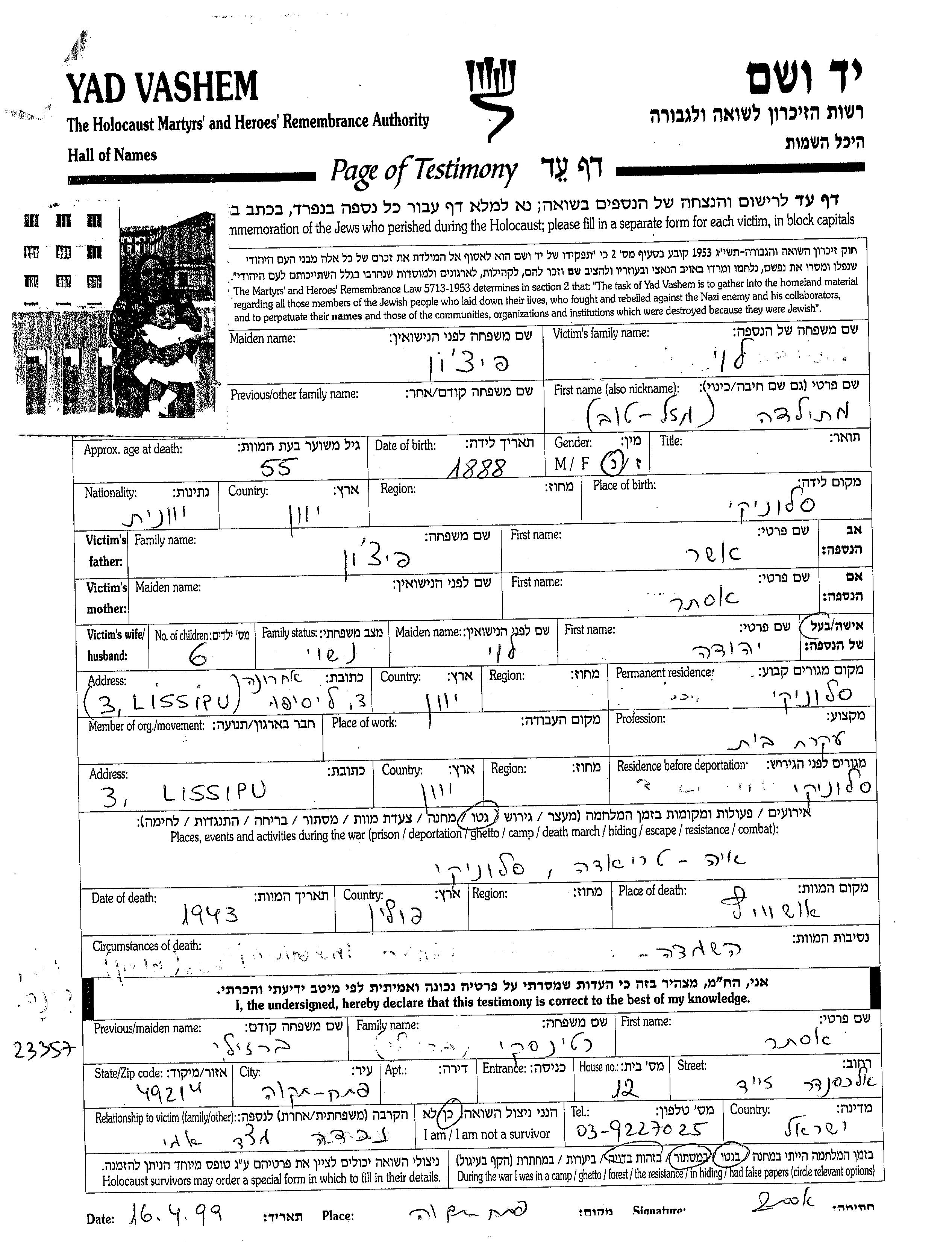 Yad Vashem - Pages of Testimony Names Memorial Collection