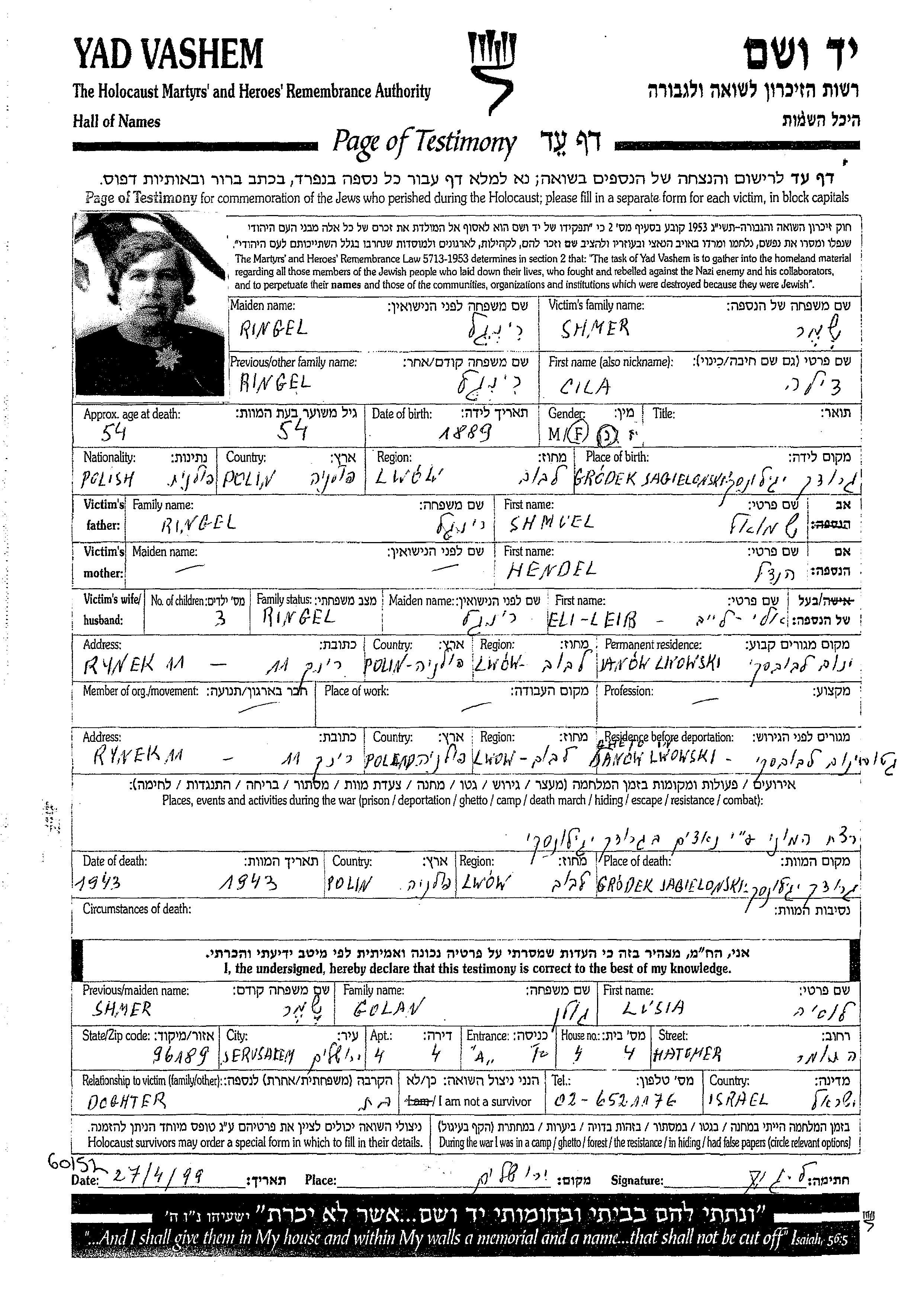 Cila Shmer née Ringel est née à Grodek Jagiellonski, Pologne en 1889. Avant la seconde guerre mondiale elle vivait à Janow, Pologne.