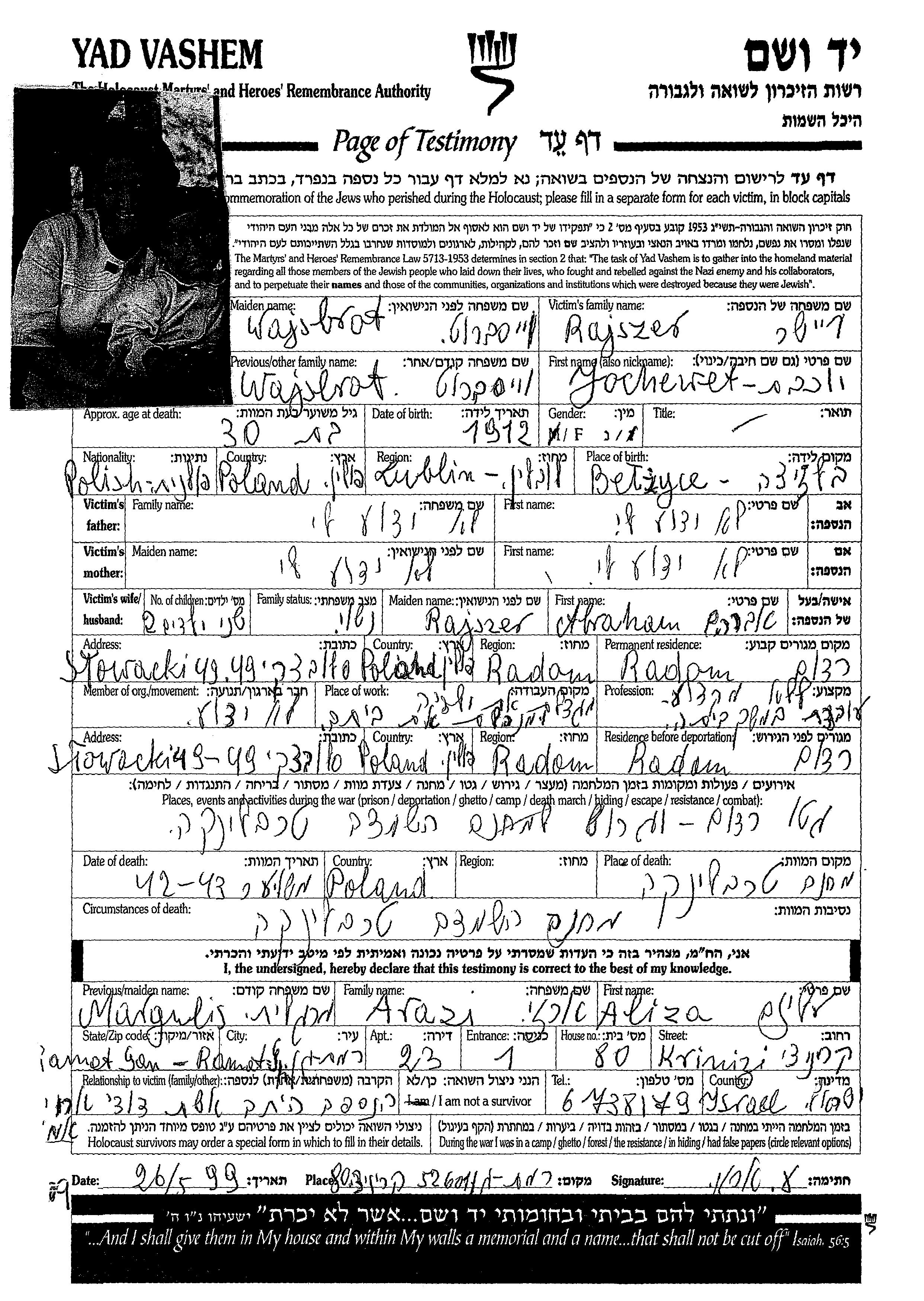 Rajszer | Yochewet | 1912 | Radom, Pologne | Feuille de témoignage |