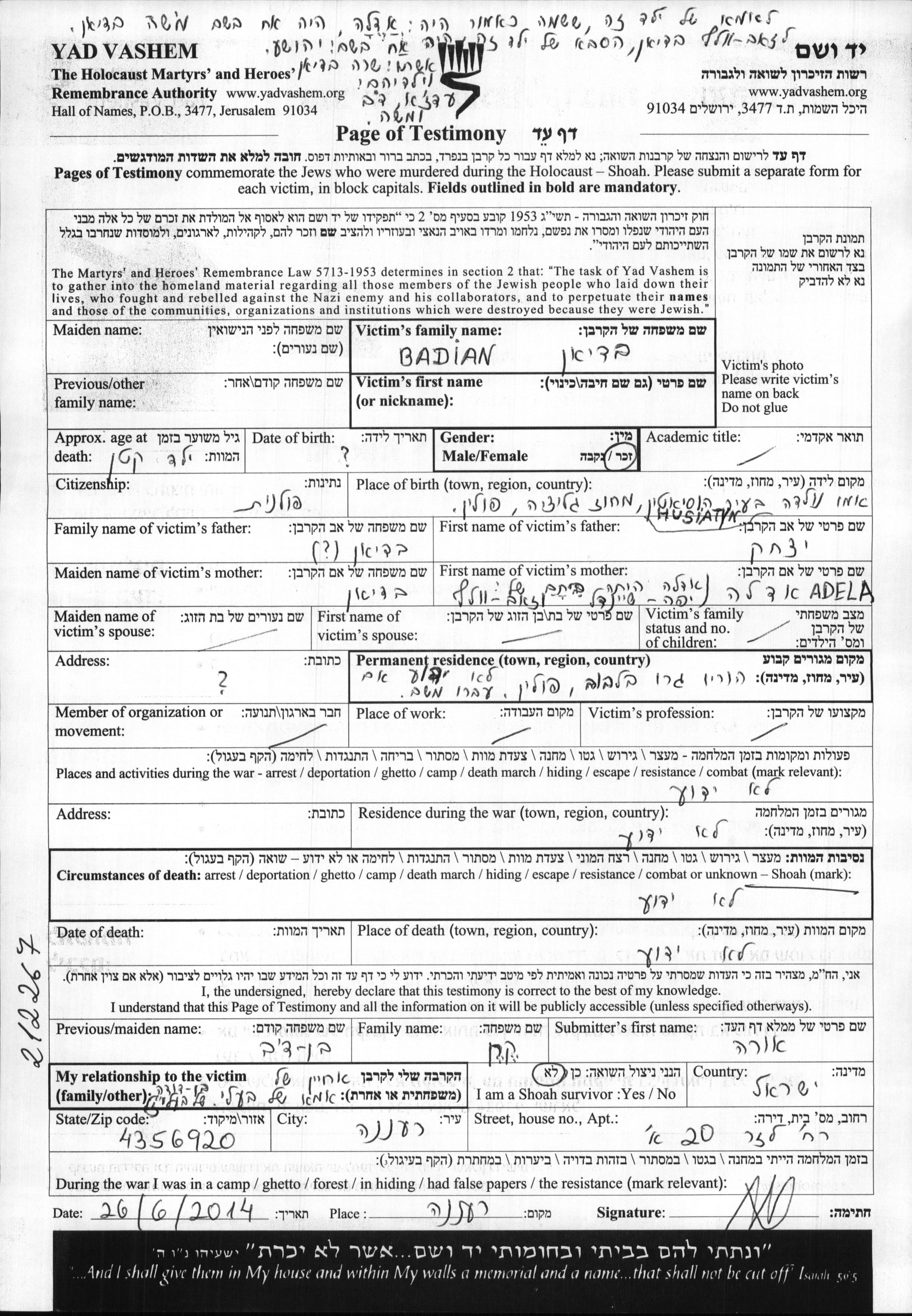 Badian prénom inconnu Lwow, Pologne Feuille de témoignage