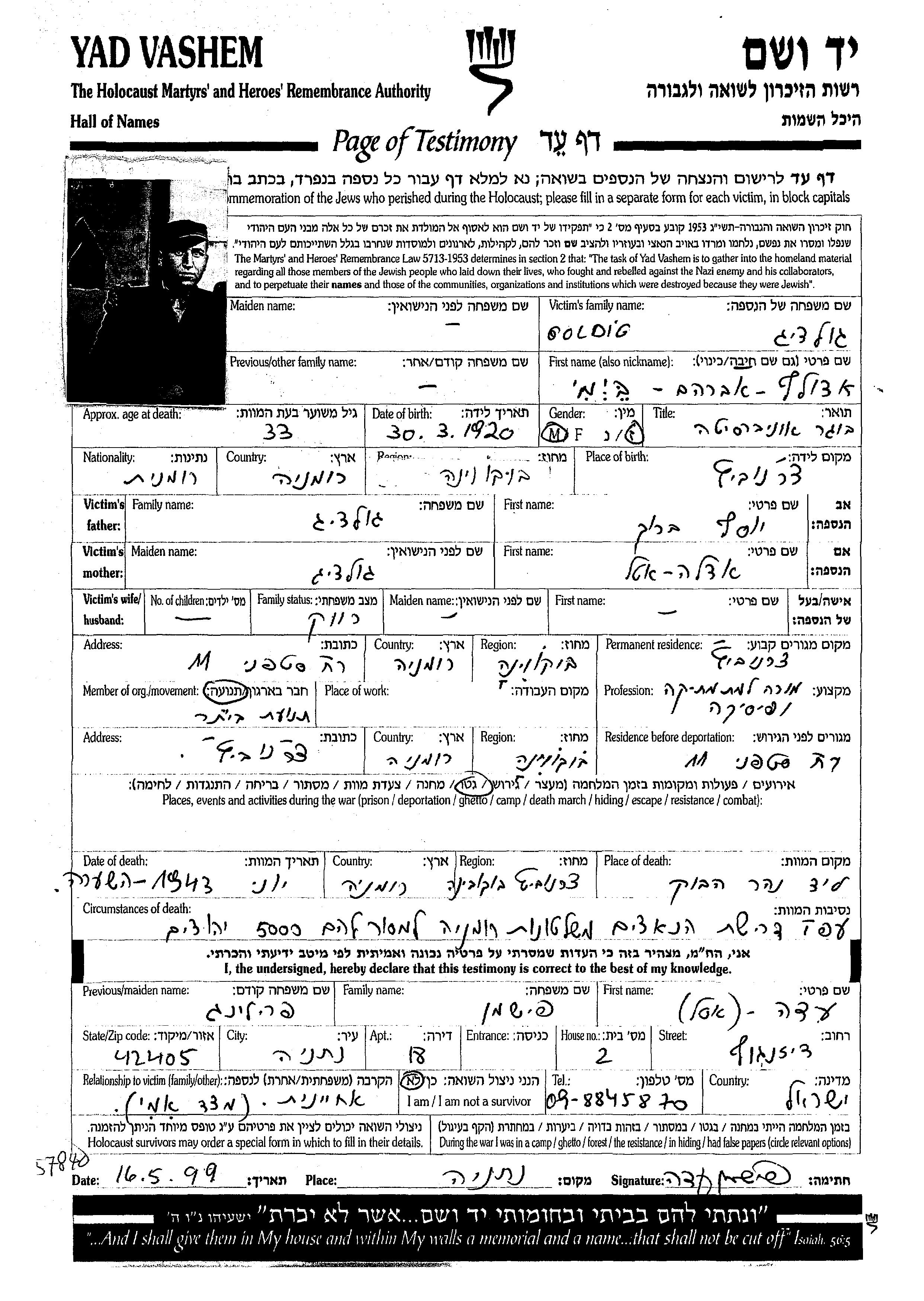 Yad Vashem - Pages of Testimony Names Memorial Collection