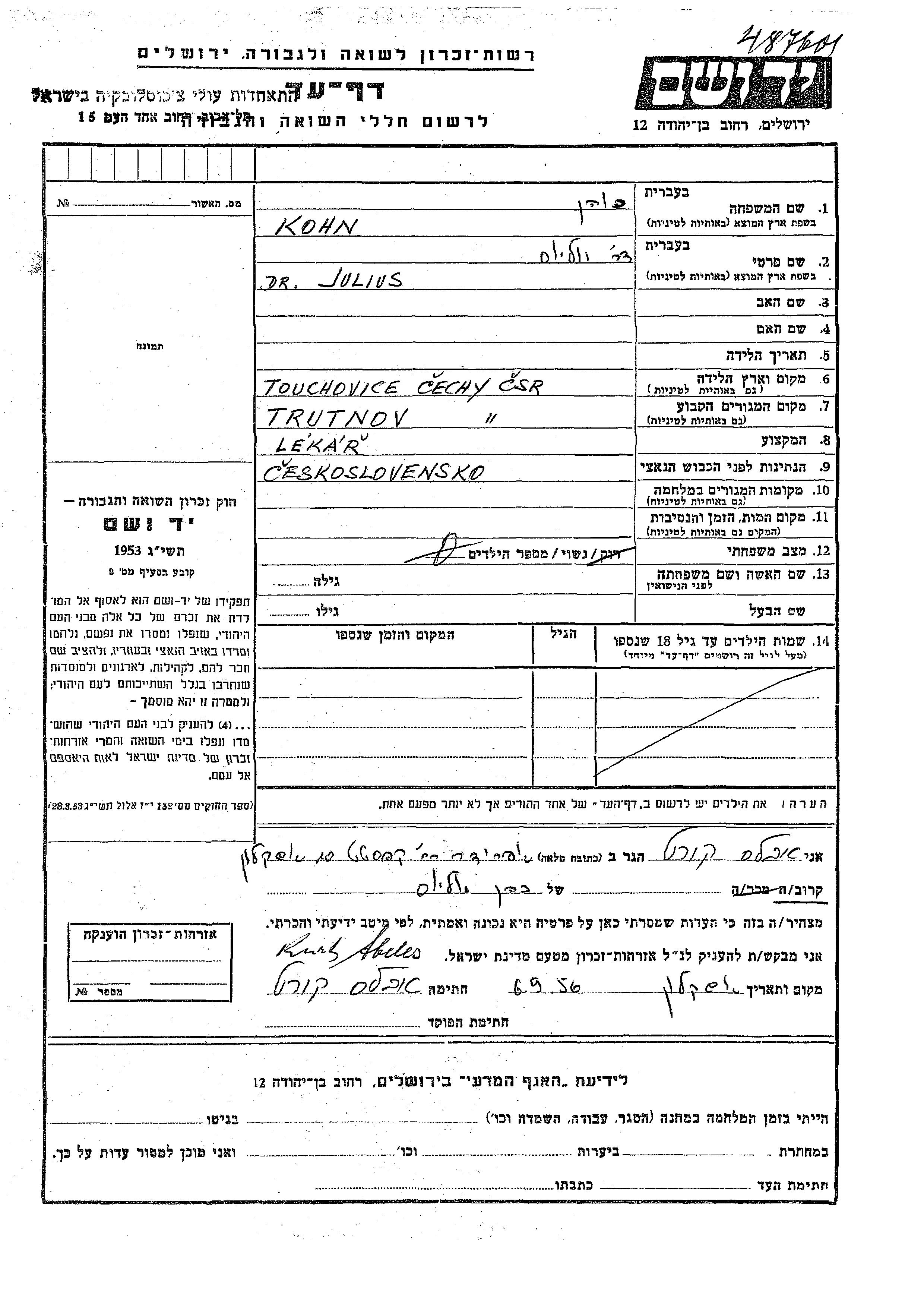 Kohn Julius Trutnov, Tchécoslovaquie Feuille de témoignage