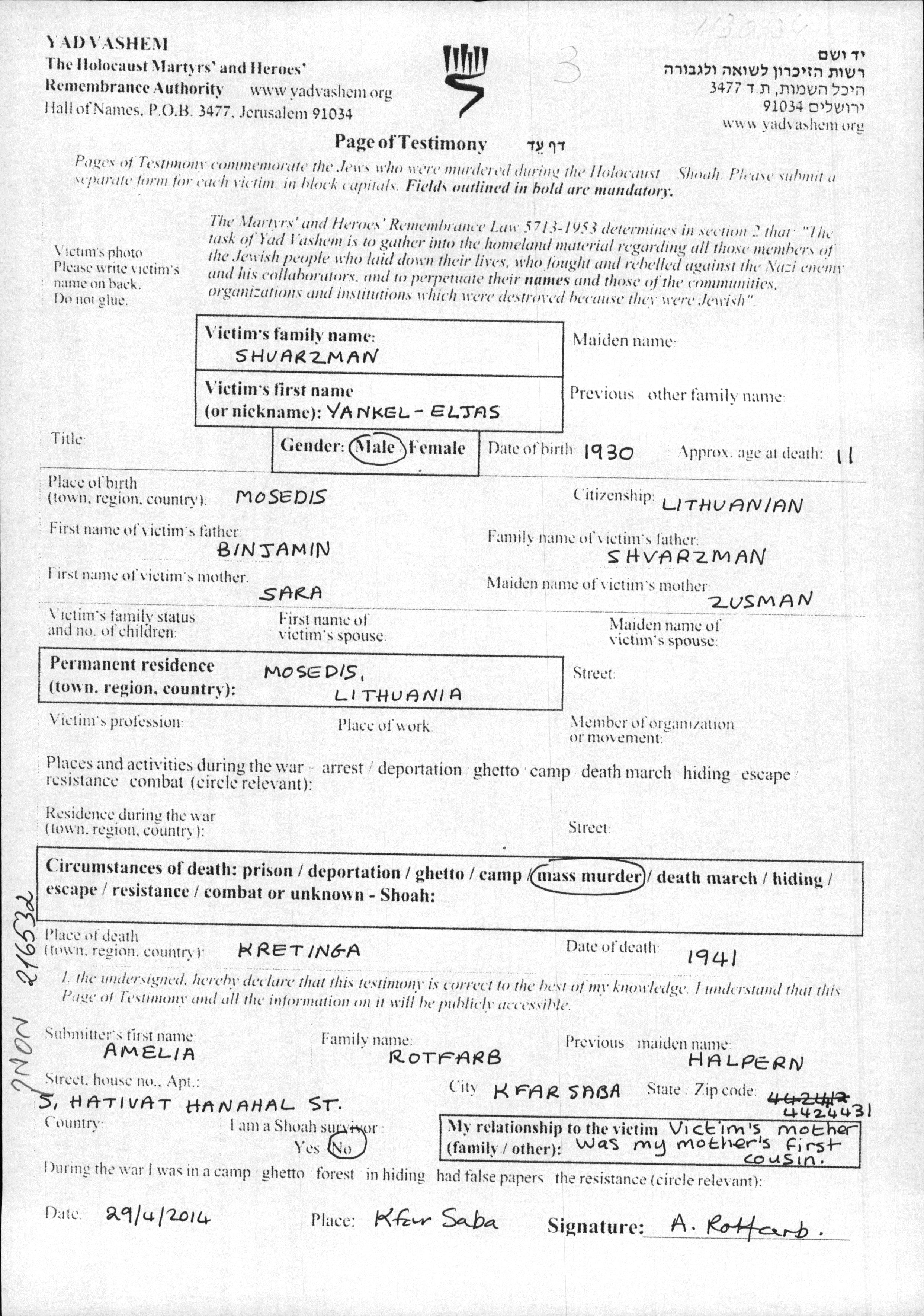 Shvarzman Yankel Elias 1930 Mosedis, Lituanie Feuille de témoignage