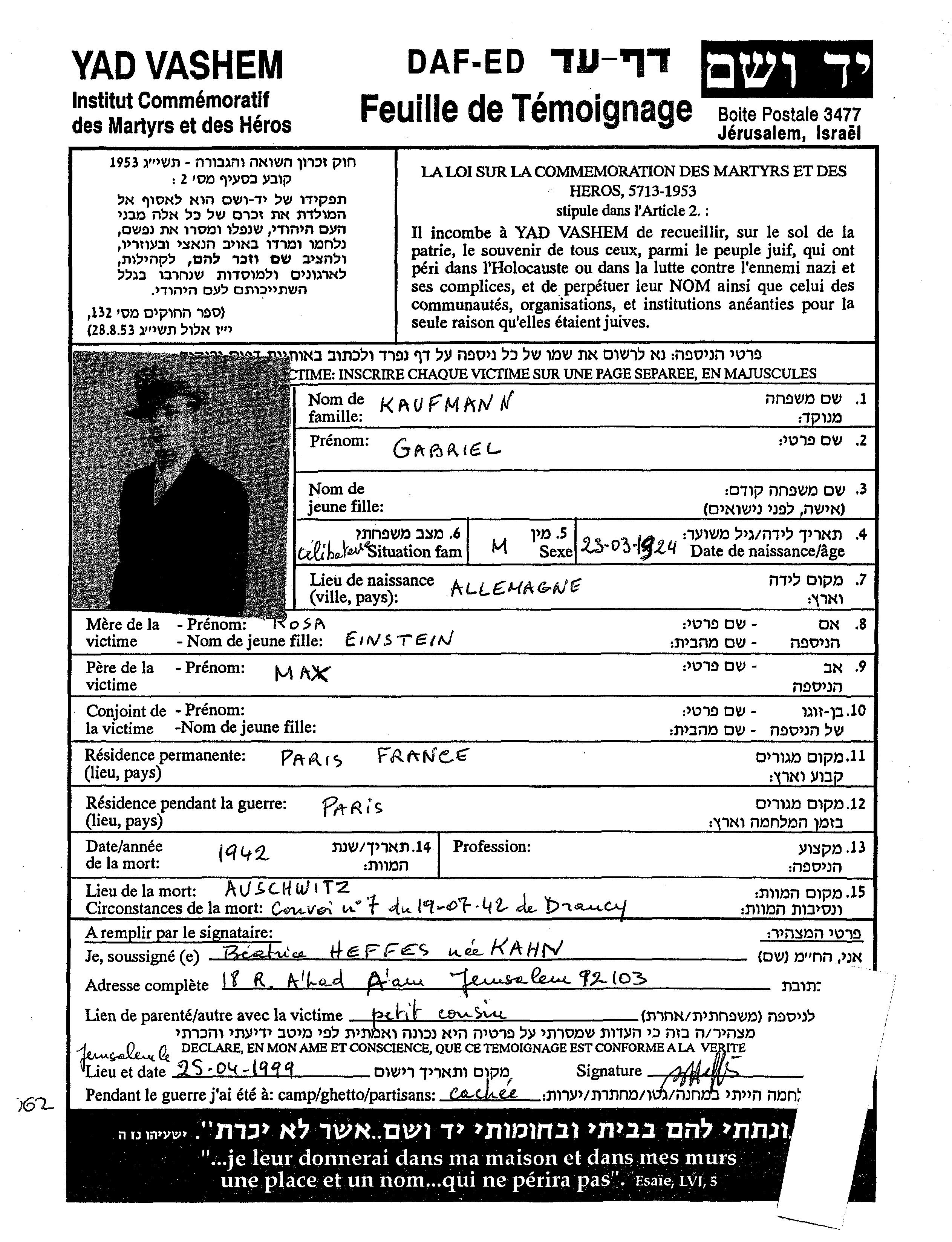 Kaufmann Gabriel 1924 Paris, France Feuille de témoignage
