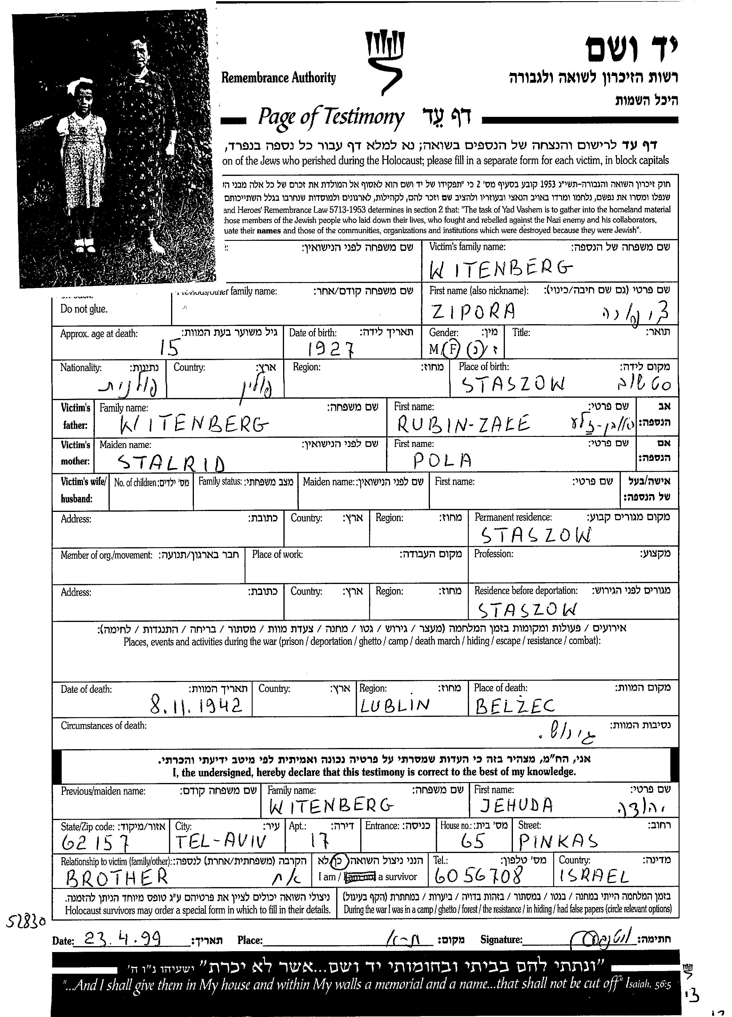 Witenberg | Zipora | 1927 | Staszow, Pologne | Feuille de témoignage |