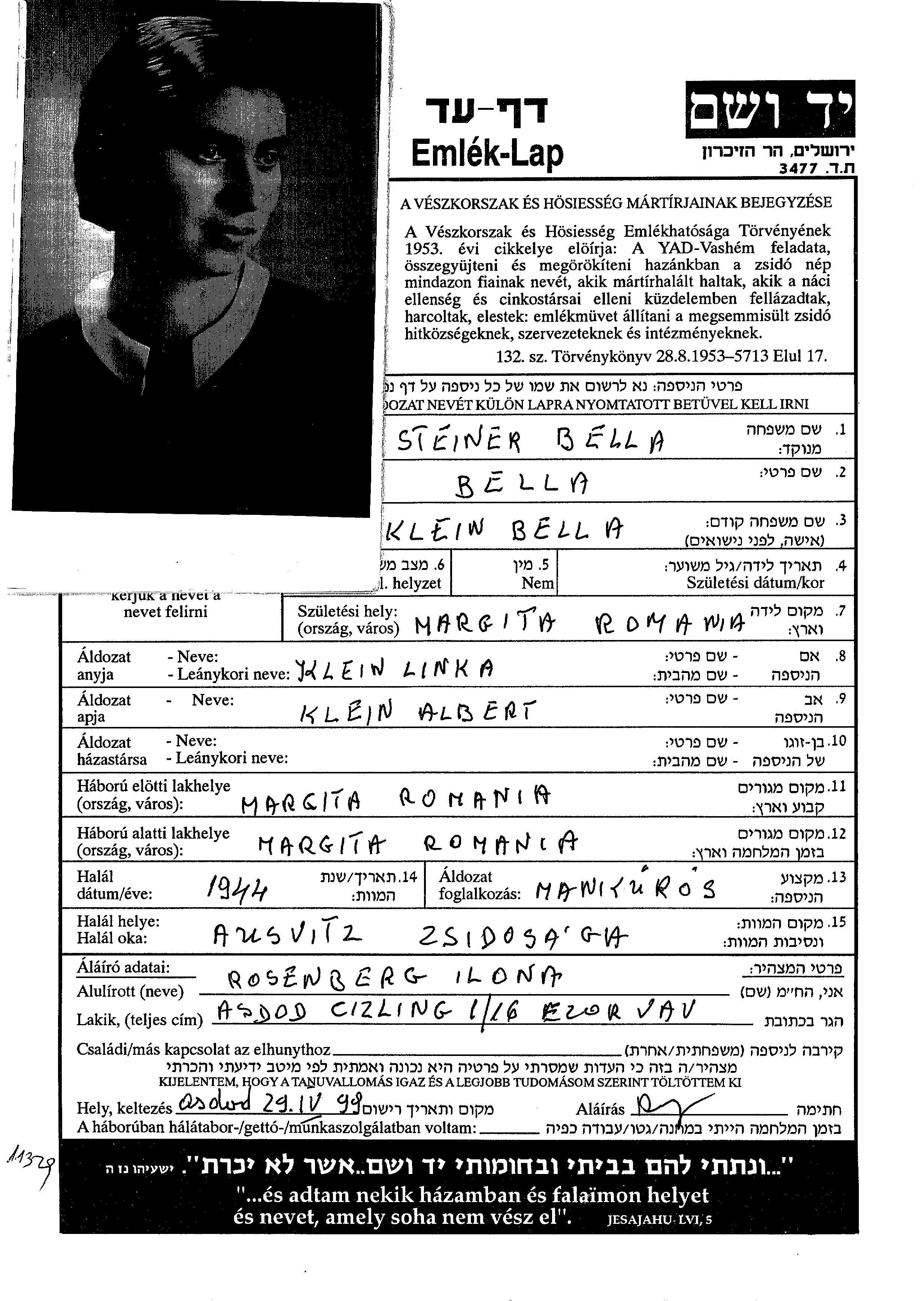 Steiner Bella Margita, Roumanie Feuille de témoignage