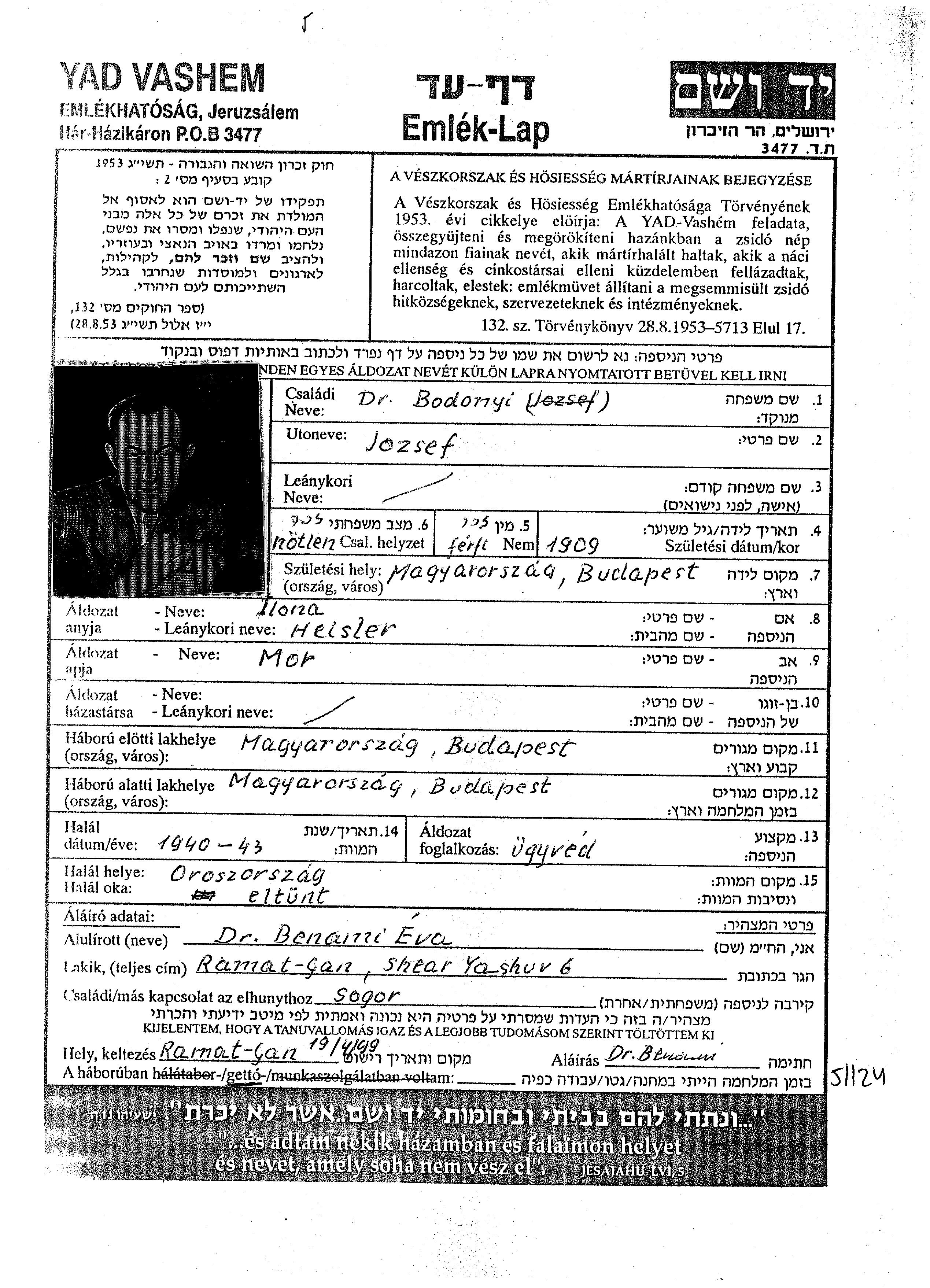 Buduni Josef 1902 Budapest, Hongrie Feuille de témoignage