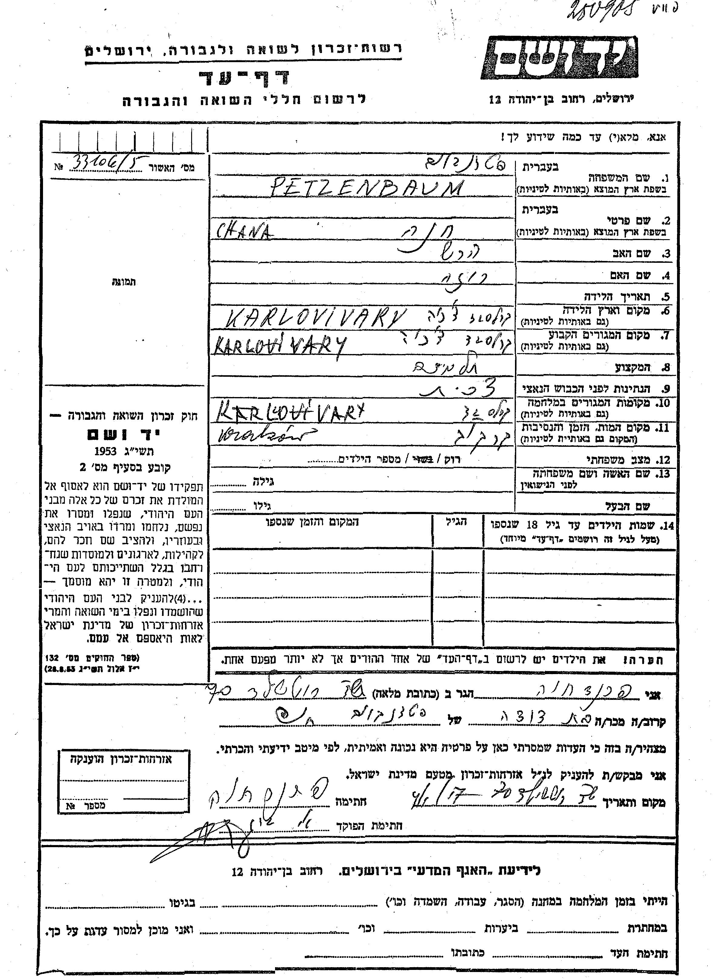 Yad Vashem - Pages of Testimony Names Memorial Collection