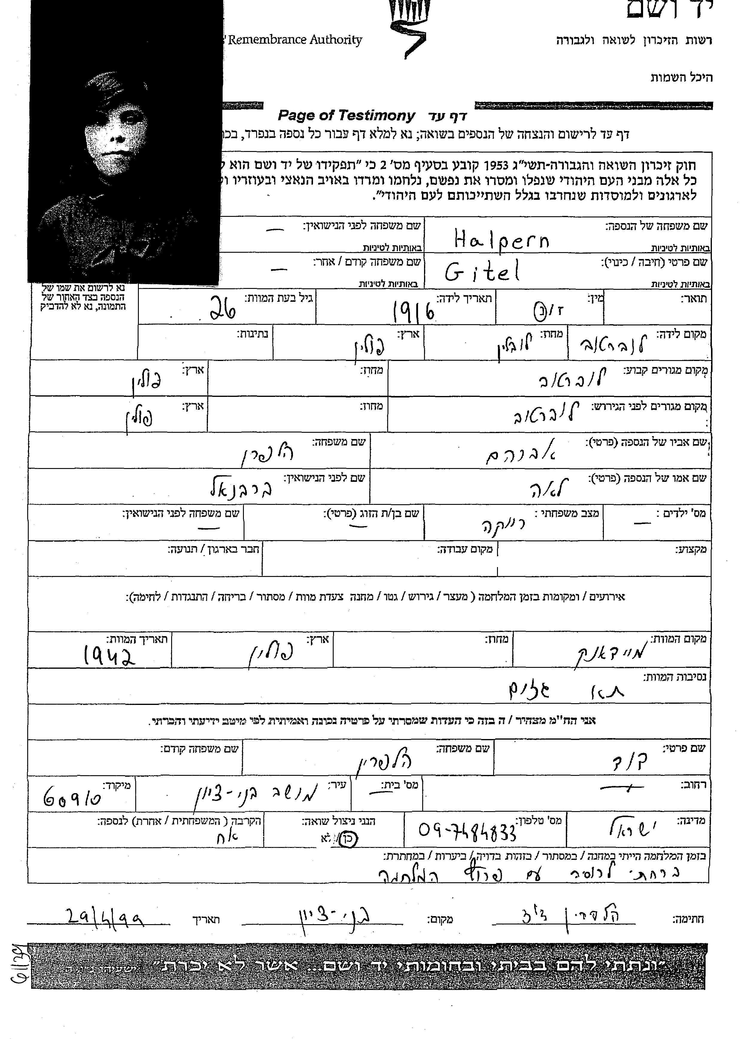 Halpern Gitel 1916 Lubartow, Pologne Feuille de témoignage