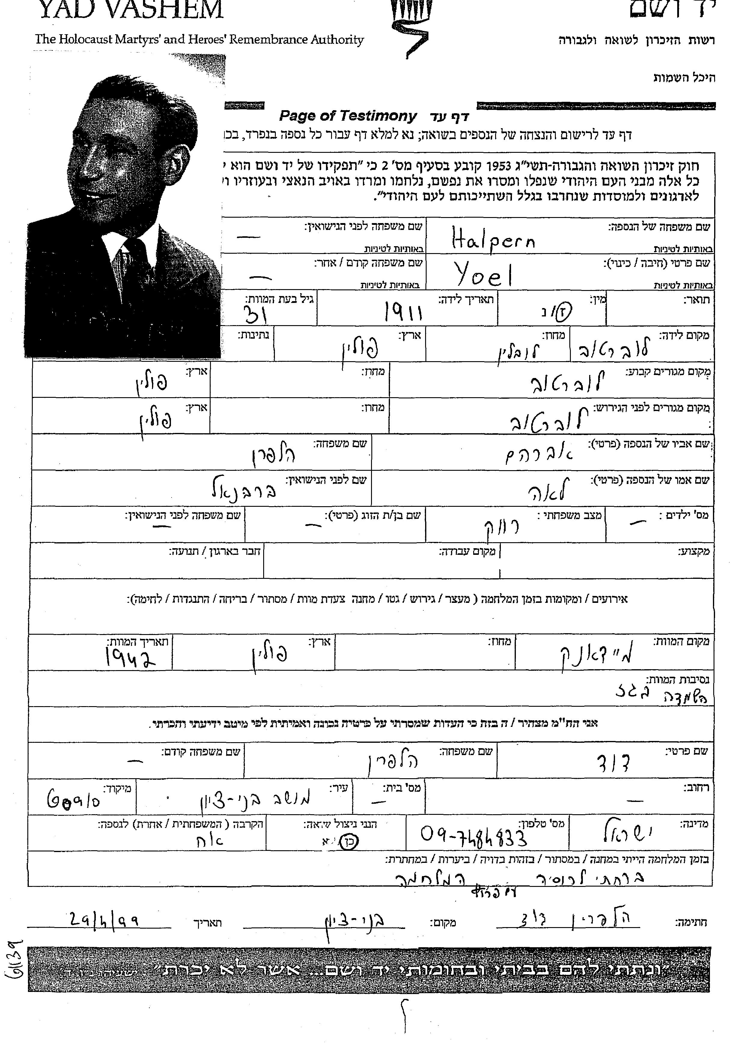 Yoel Halpern est né à Lubartow, Pologne en 1911. Avant la seconde guerre mondiale il vivait à Lubartow, Pologne.