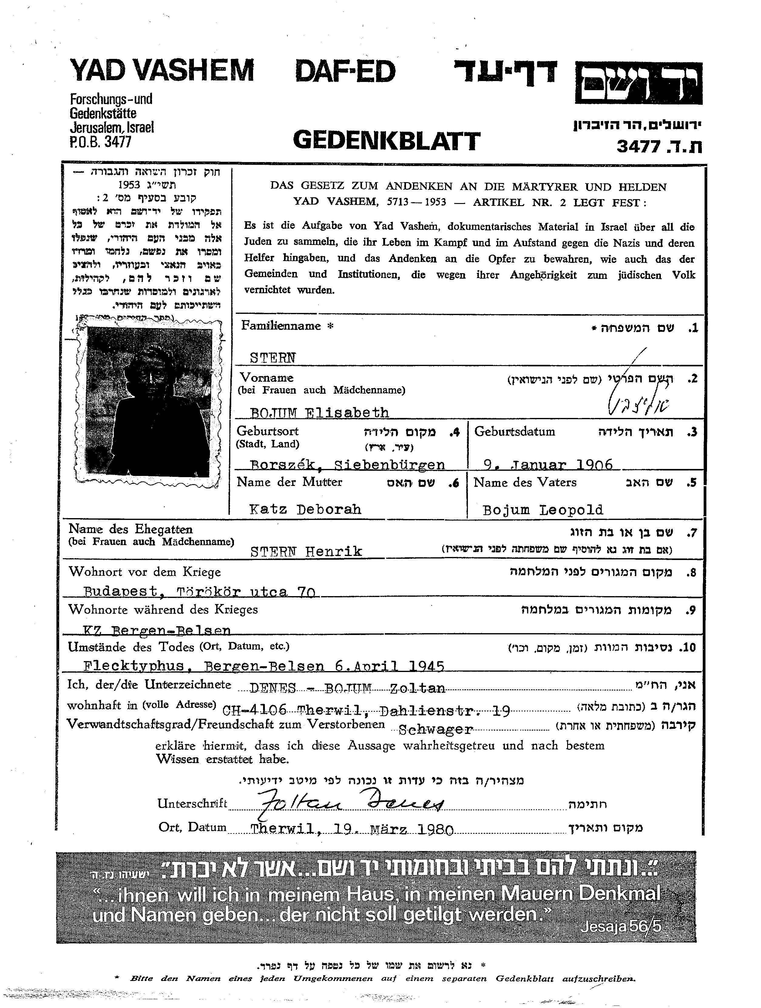 Stern Elisabeth 1906 Budapest, Hongrie Feuille de témoignage