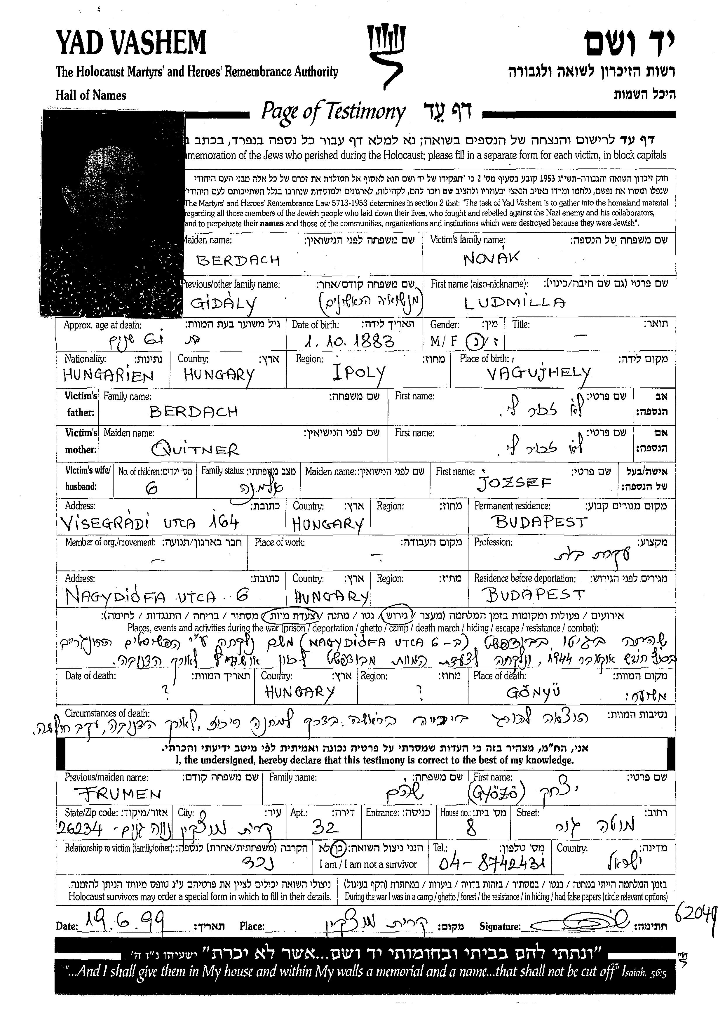 Novak Gidaly Ludmilla 1883 Budapest, Hongrie Feuille de témoignage