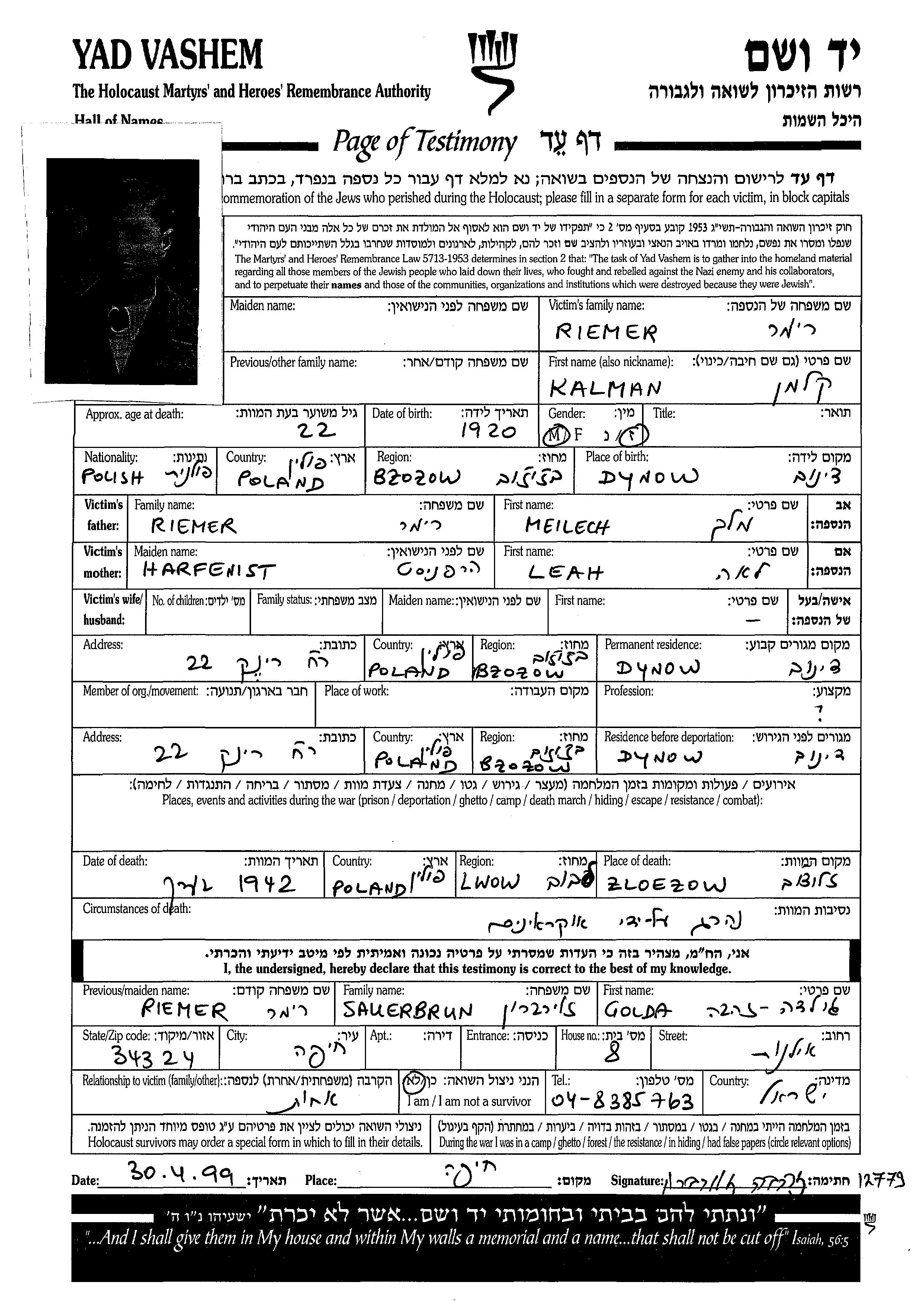 Riemer Kalman 1920 Dynow, Pologne Feuille de témoignage
