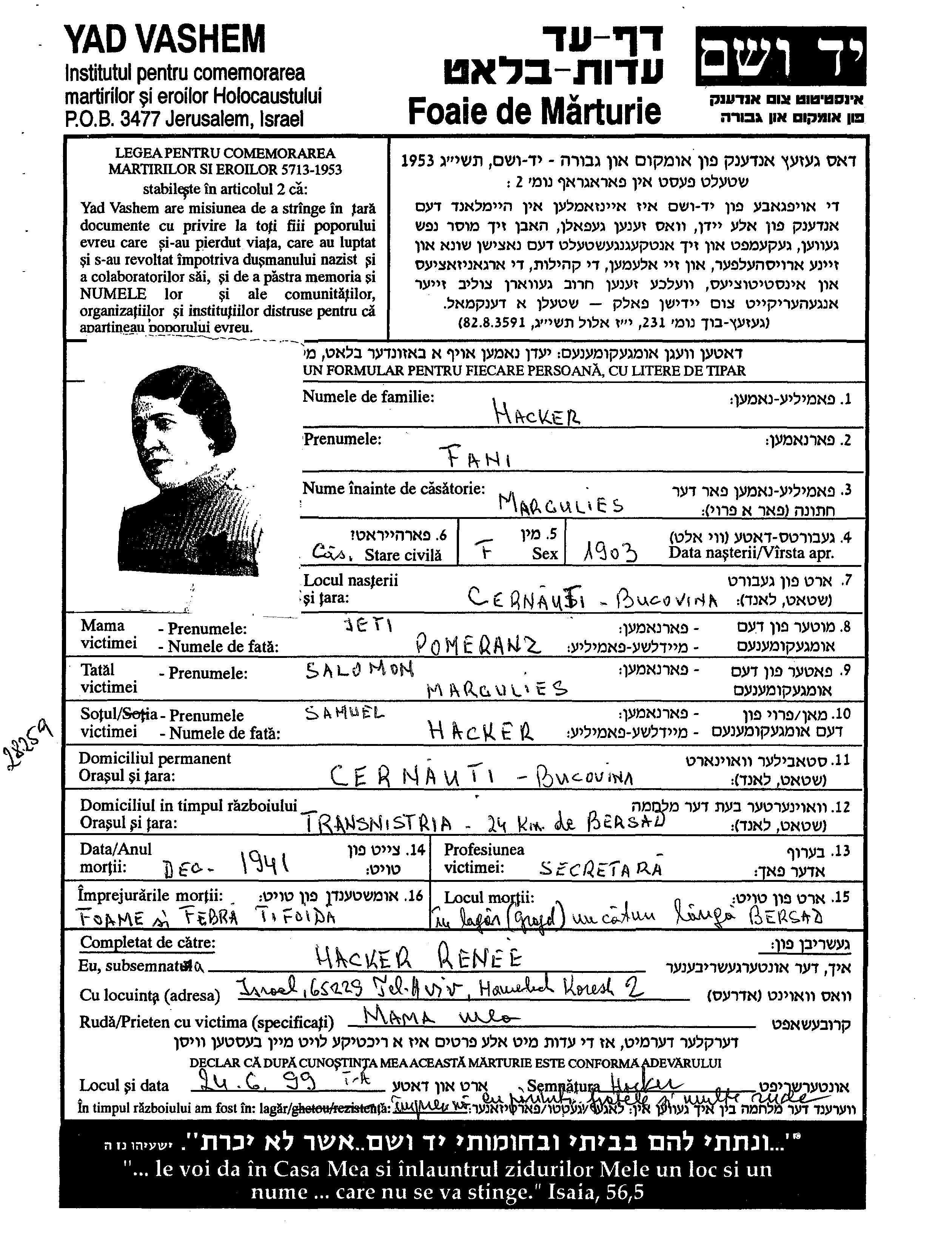 Fani Hacker née Margulies est née à Cernauti, Roumanie en 1903. Elle était Secretara. Avant la seconde guerre mondiale elle vivait à Cernauti, Roumanie.