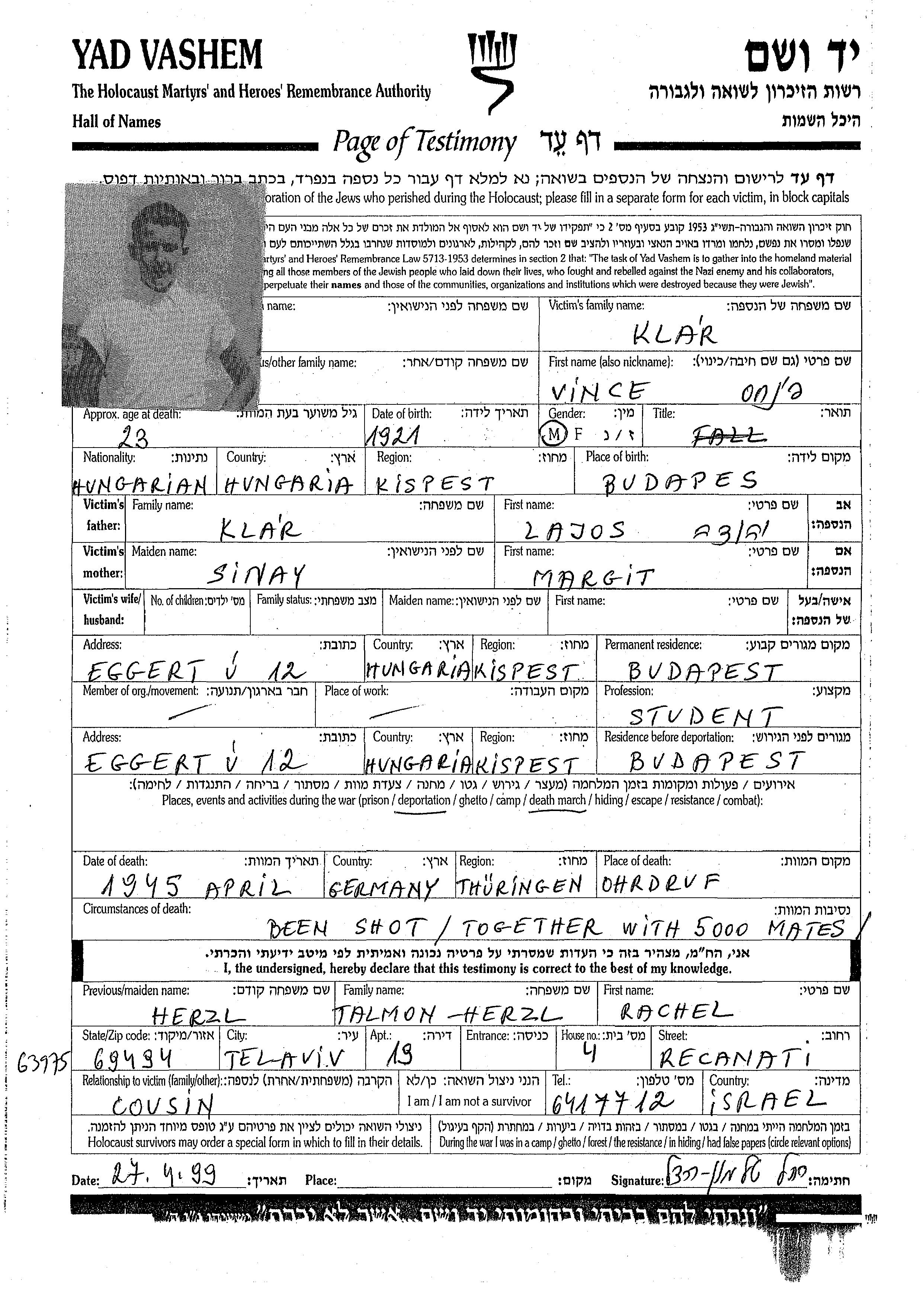 Klar Vince Pinkhas 1921 Budapest, Hongrie Feuille de témoignage