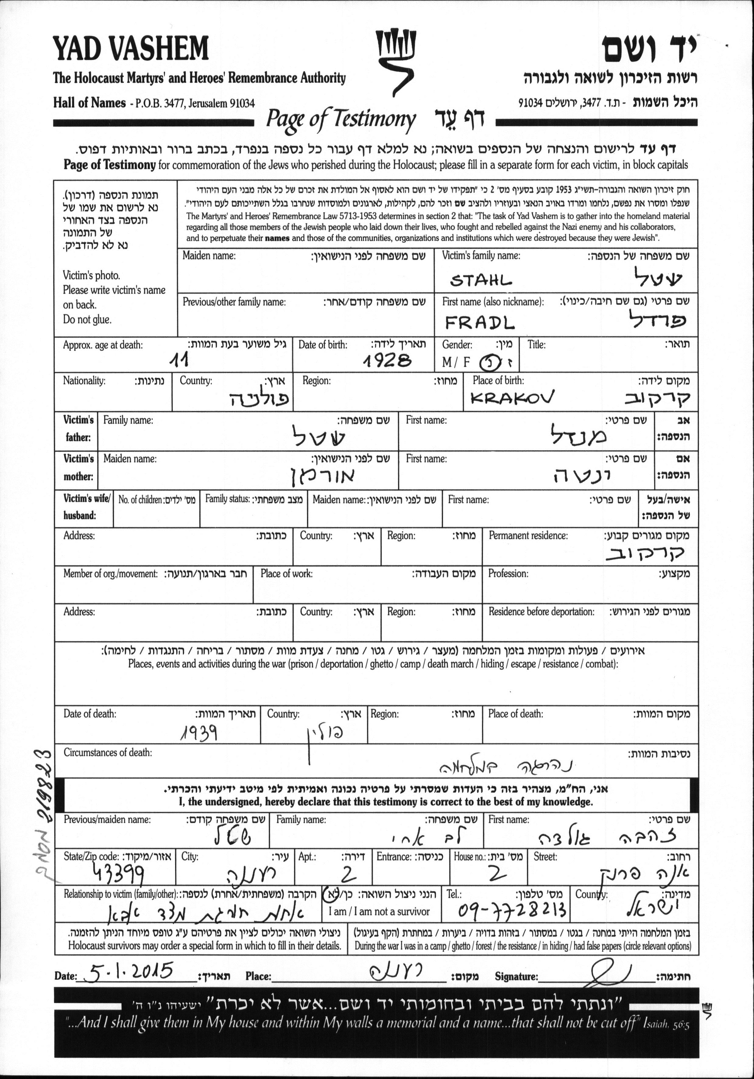 Sthal | Fradl | 1928 | Krakov, Pologne | Feuille de témoignage |