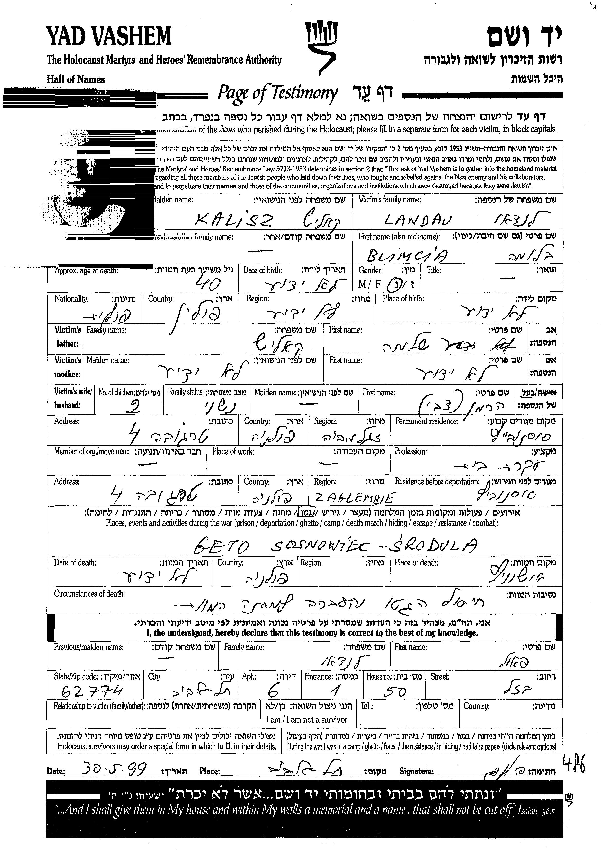 Landau Blimcia Sosnowiec, Pologne Feuille de témoignage