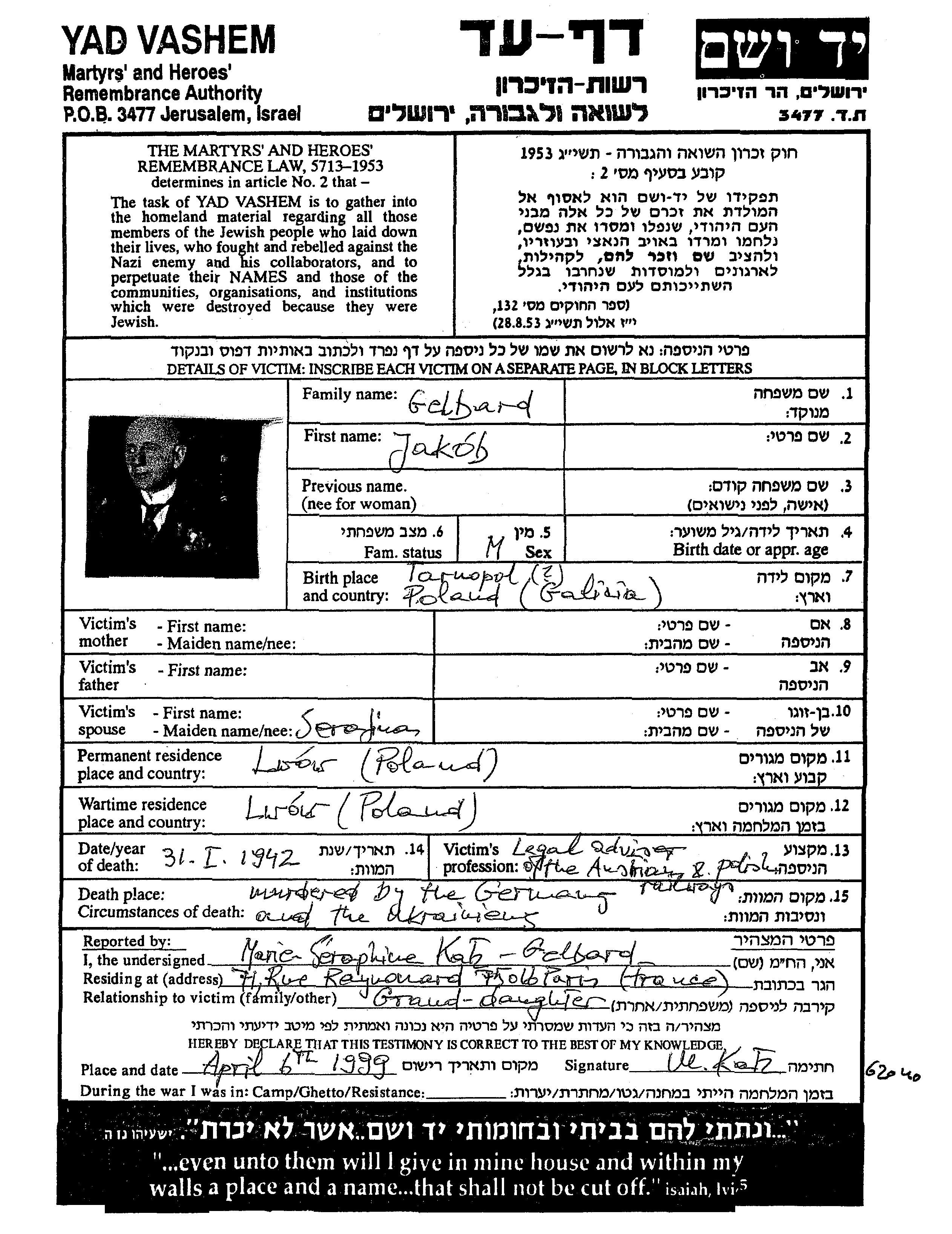 Gelbard Jakob Lwow, Pologne Feuille de témoignage