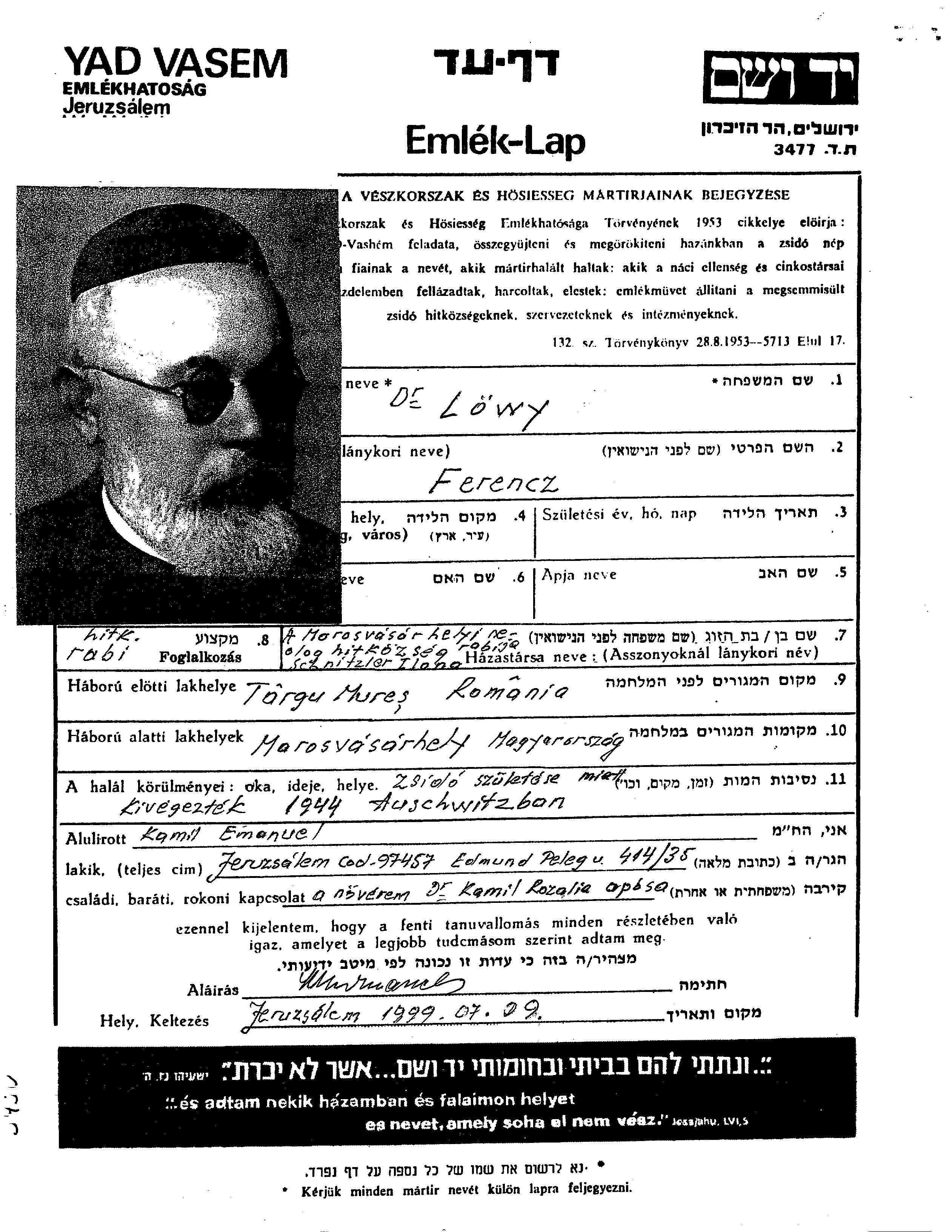 Loewy Ferencz Targu Mures, Roumanie Feuille de témoignage