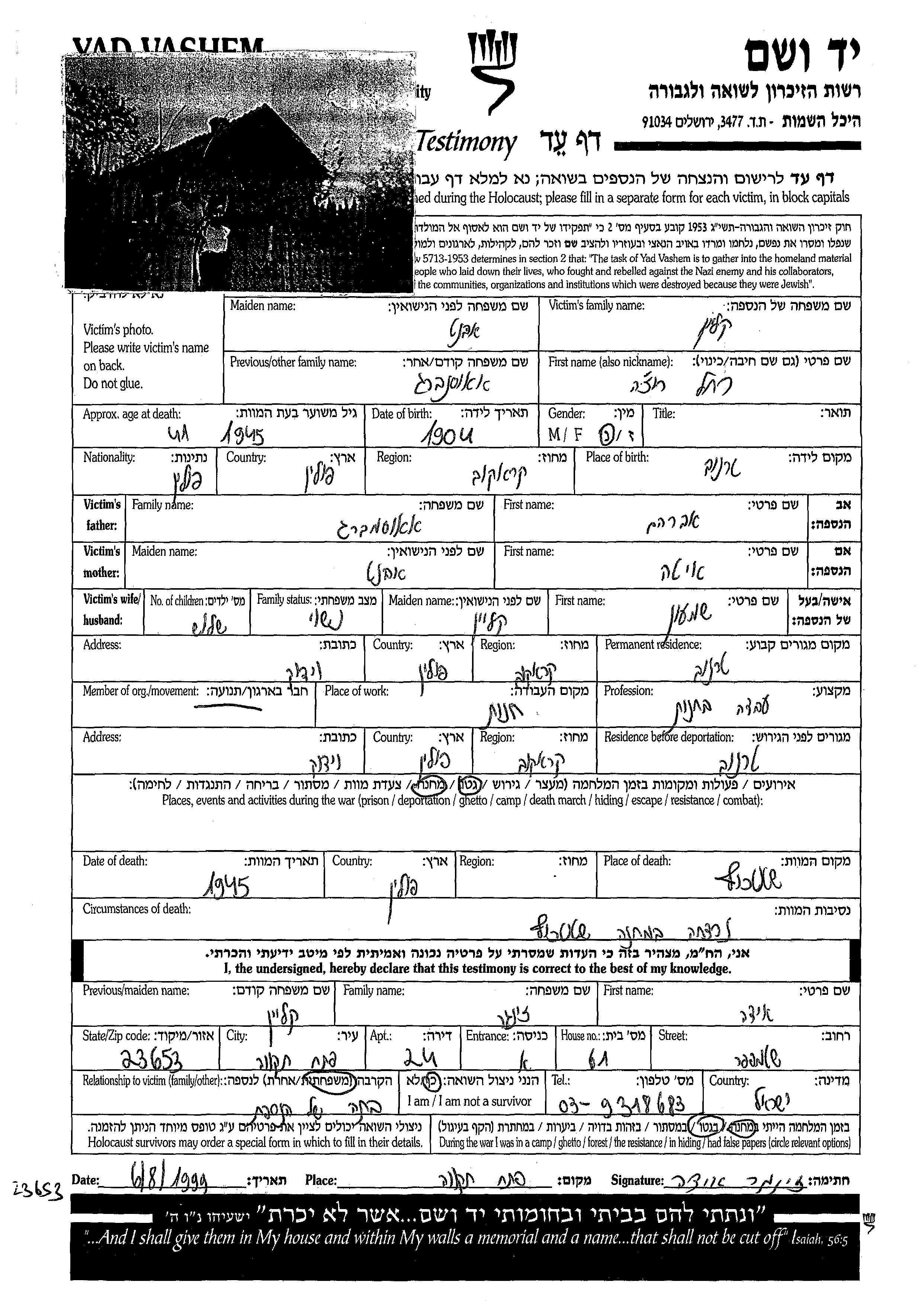 Klein Ausenberg | Rakhel | 1904 | Tarnow, Pologne | Feuille de témoignage |