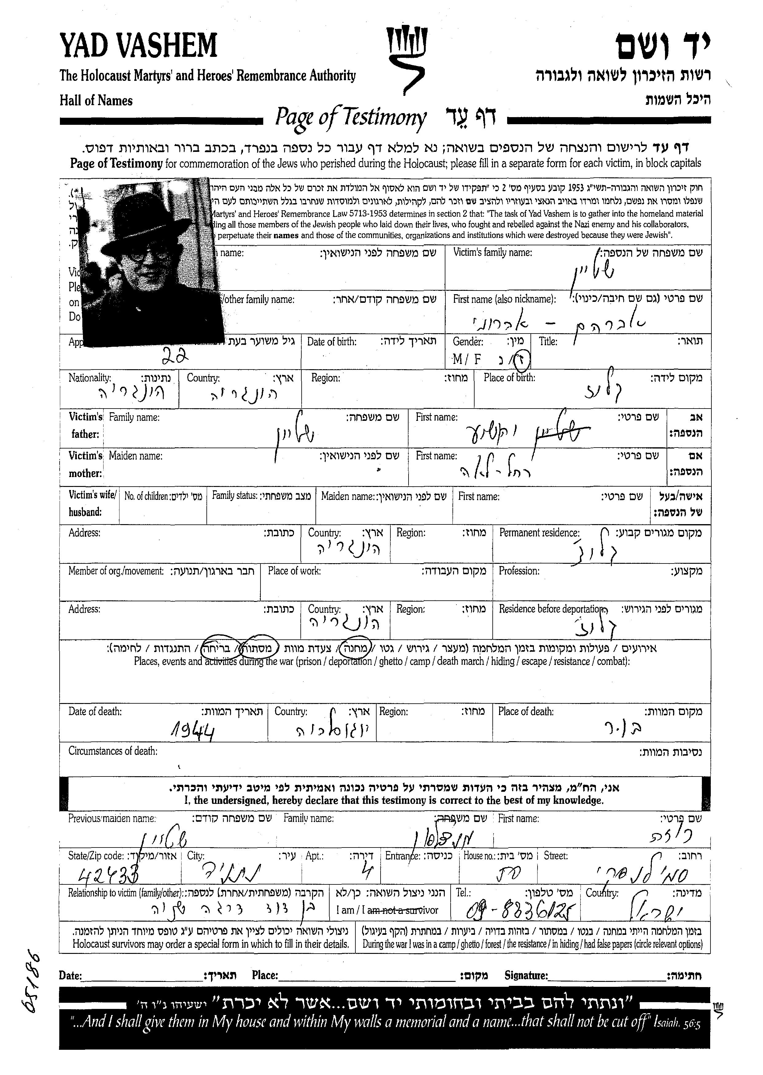 Yad Vashem - Pages of Testimony Names Memorial Collection