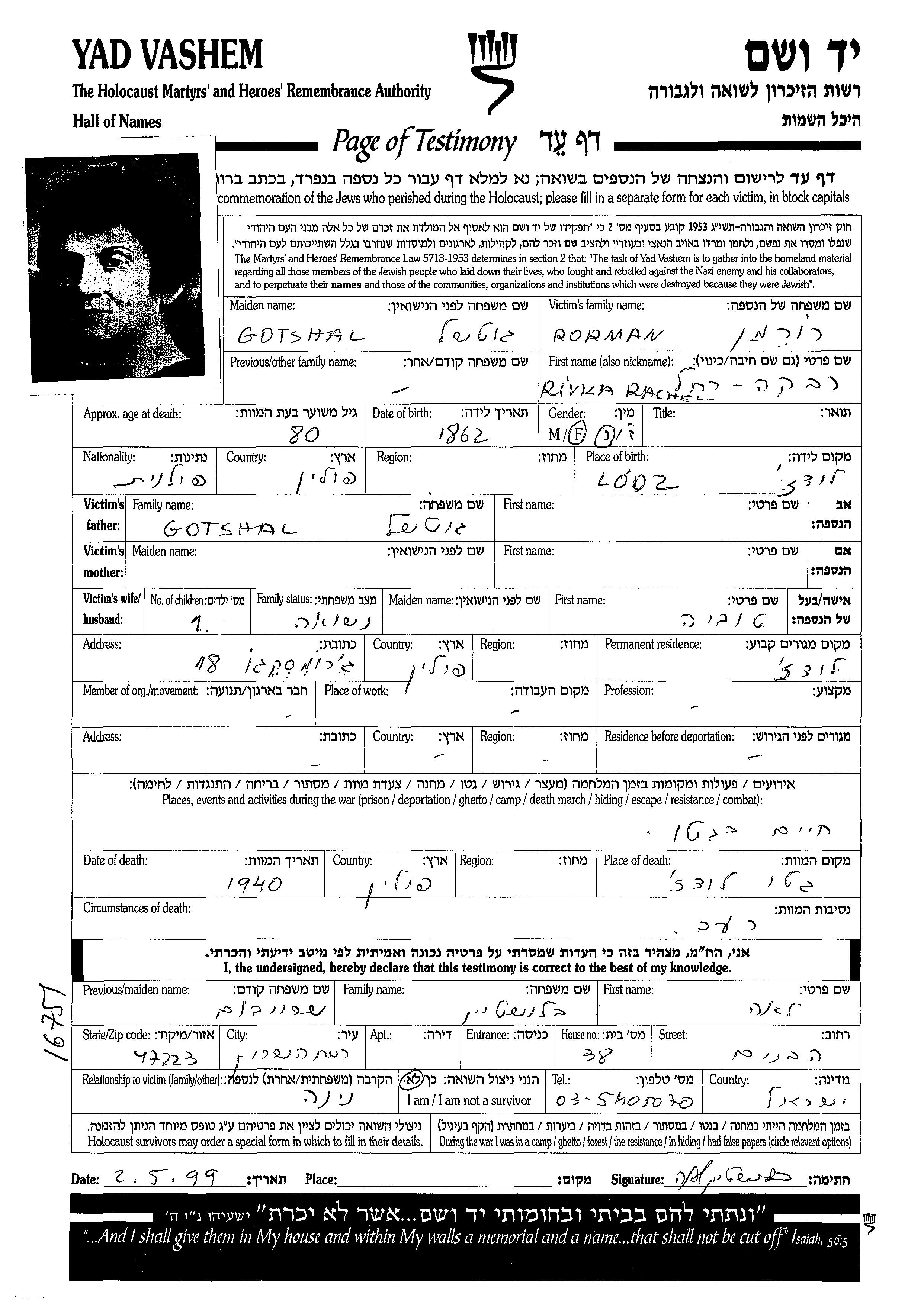 Rorman | Rachel Rivka | 1862 | Lodz, Pologne | Feuille de témoignage |