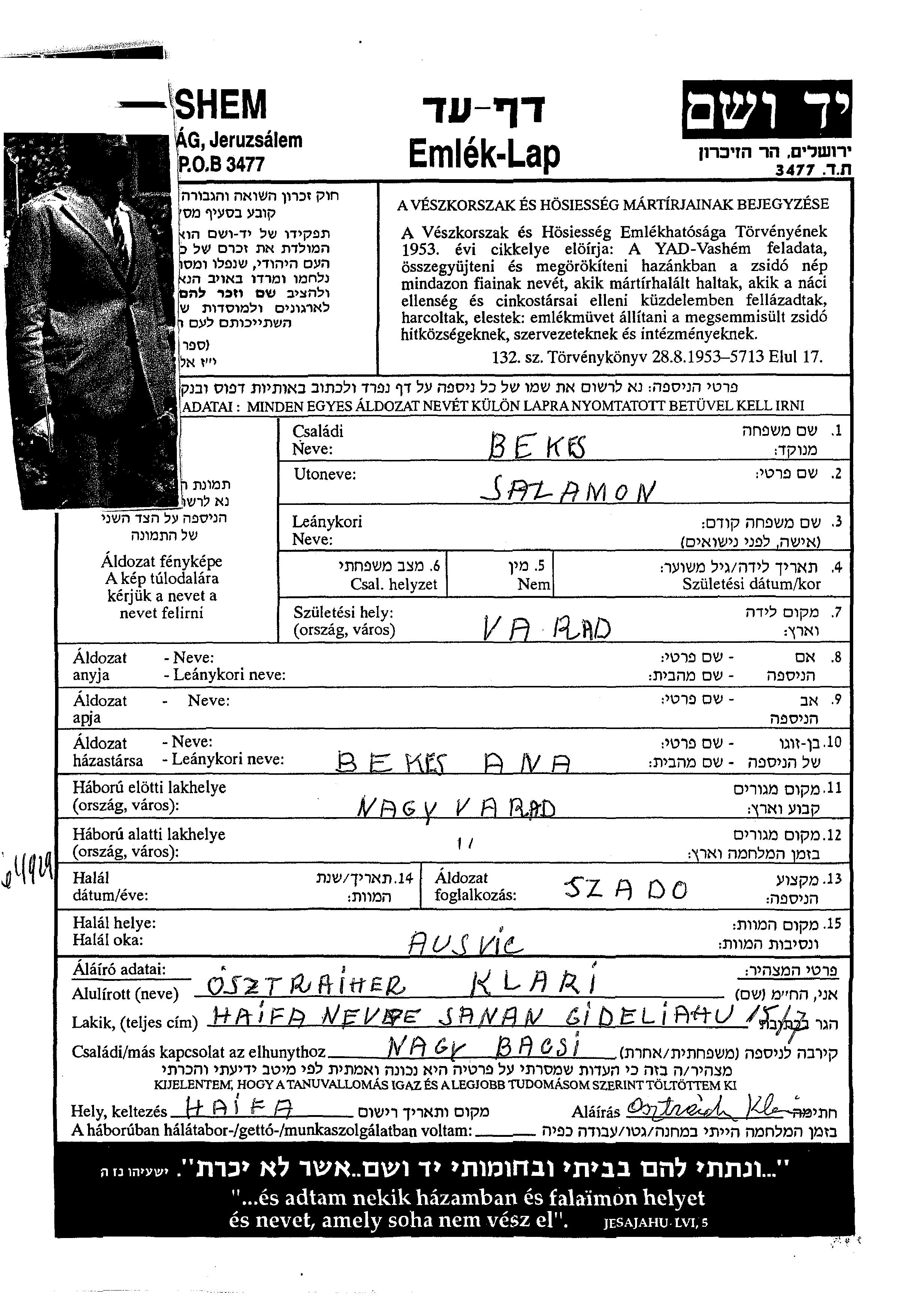 Bekes Baks Salamon Nagyvarad, Roumanie Feuille de témoignage