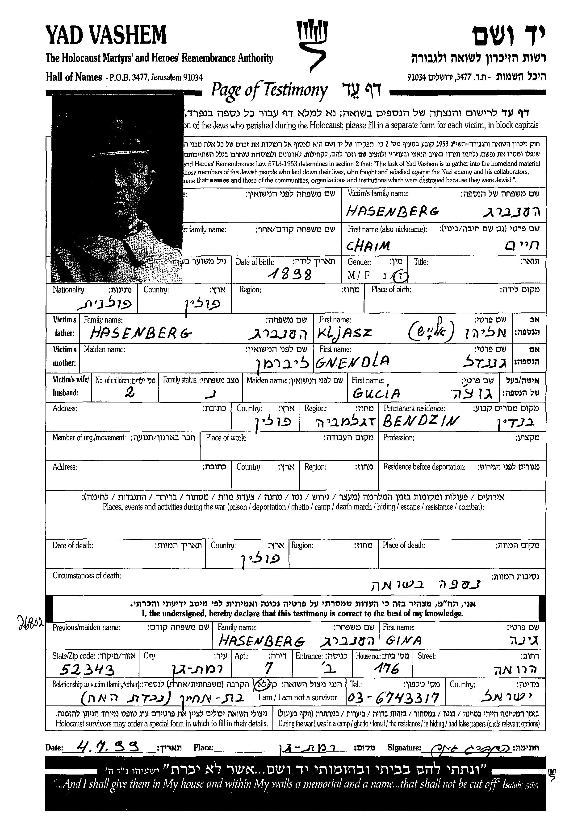 Hasenberg Chaim 1898 Bendzin, Pologne Feuille de témoignage