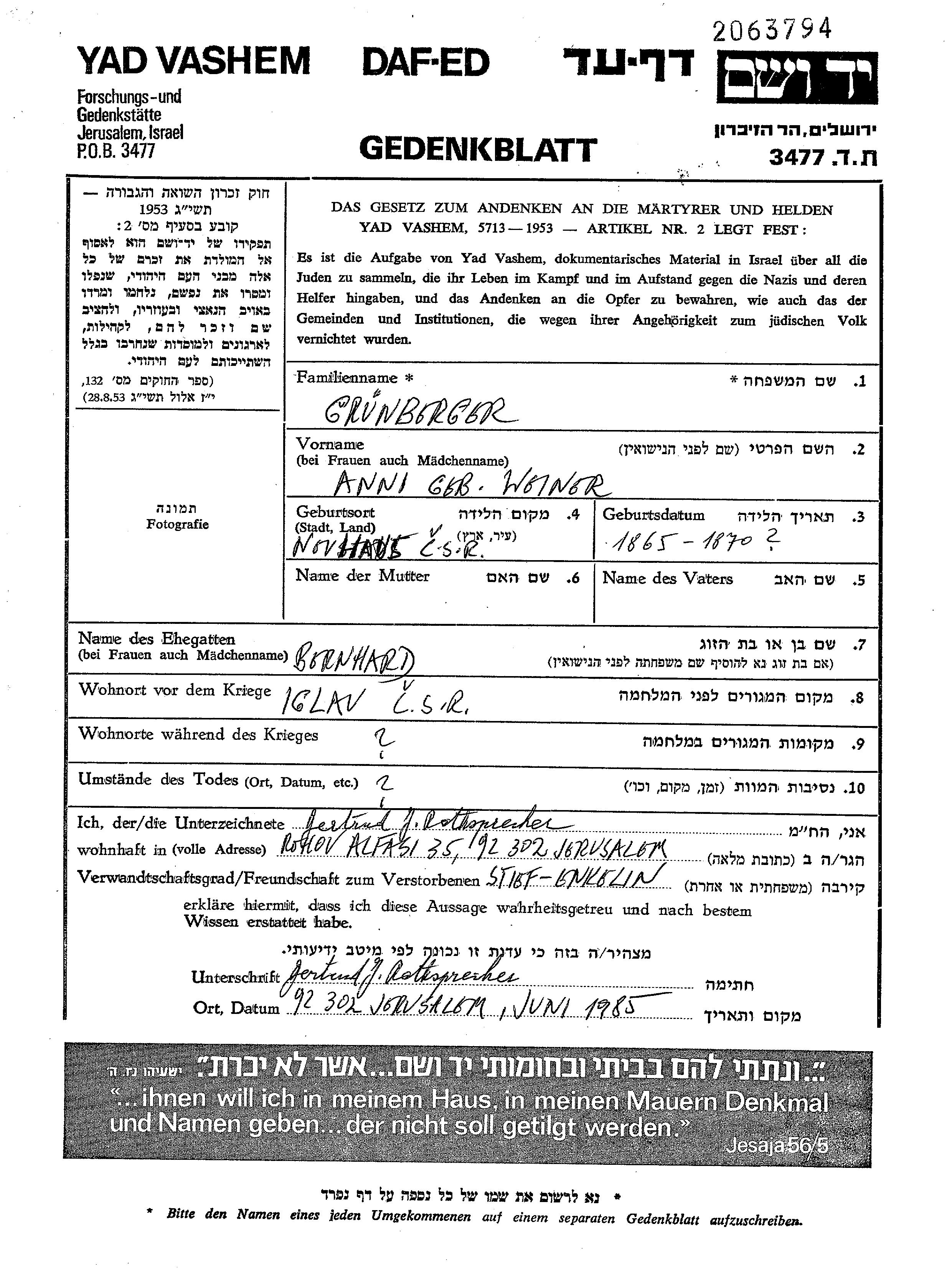 Gruenberger Anni Iglau, Tchécoslovaquie Feuille de témoignage