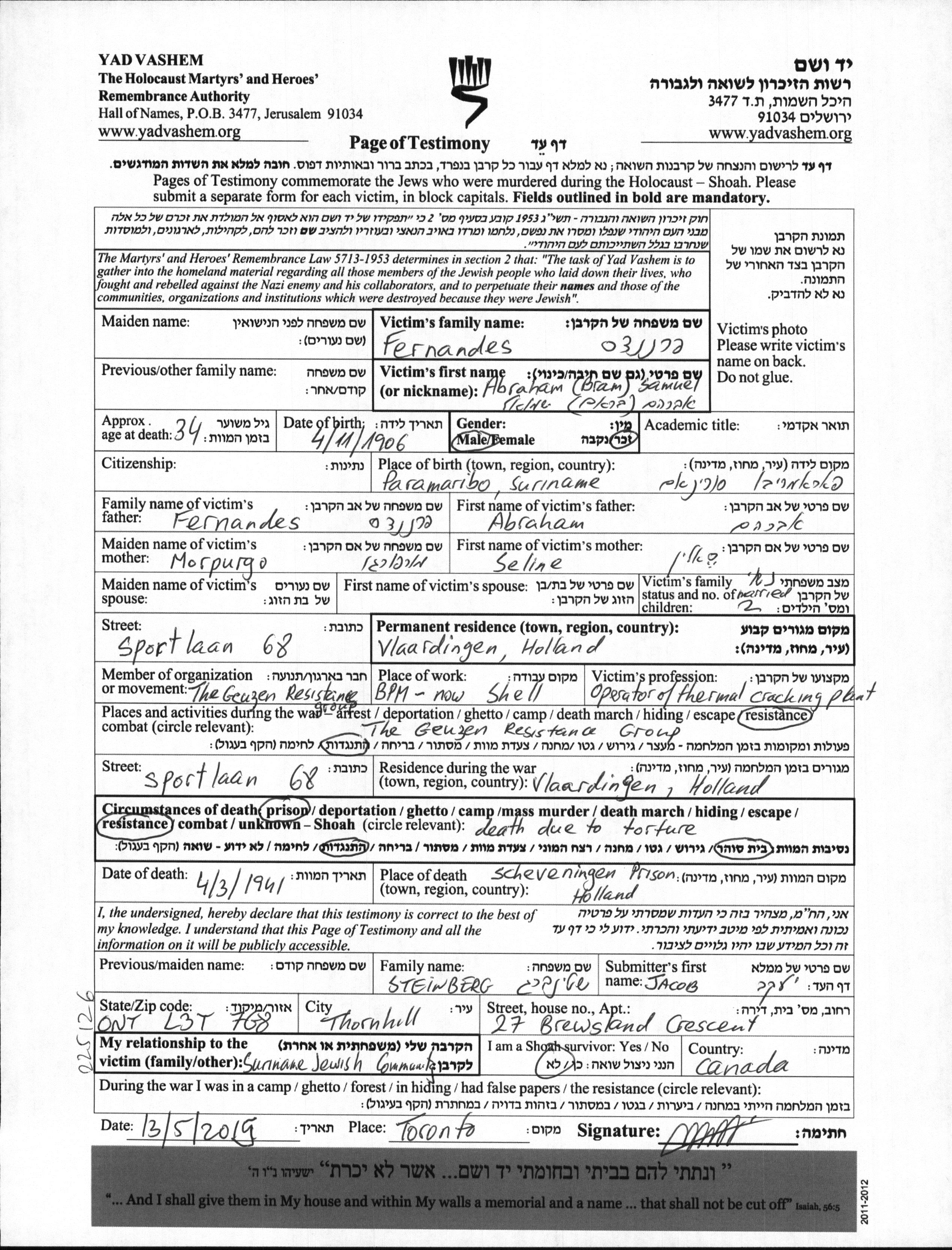 | Fernandes | Abraham Samuel | 1906 | Vlaardingen, Pays-Bas | Feuille de témoignage |